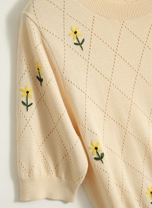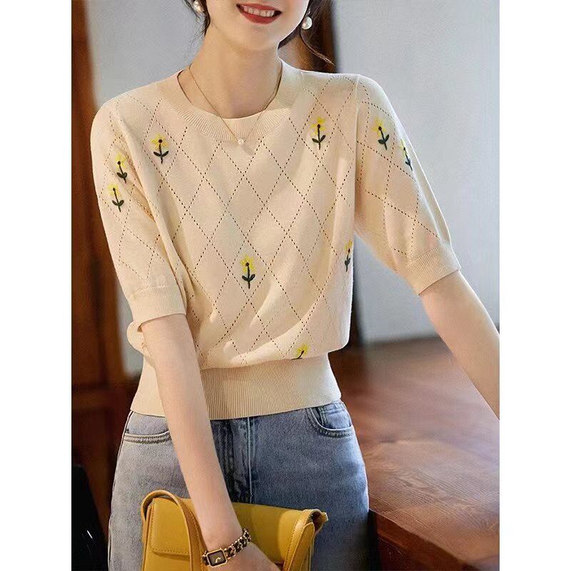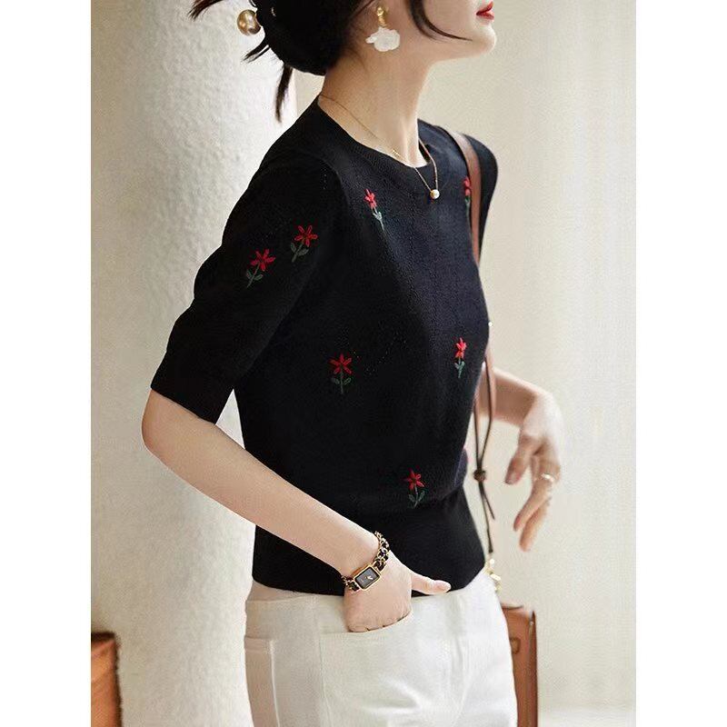 スタイル刺繍 Tシャツ O ネック Tシャツ夏半袖プルオーバー Tシャツニットトップス ショート ハーフスリーブ サマー 夏物 Oネック