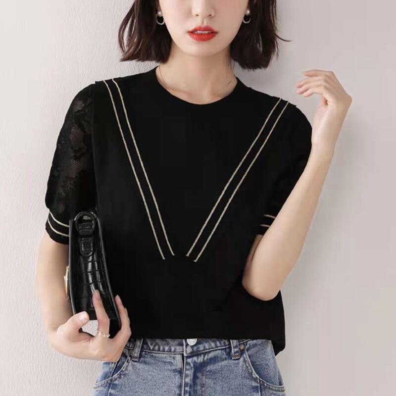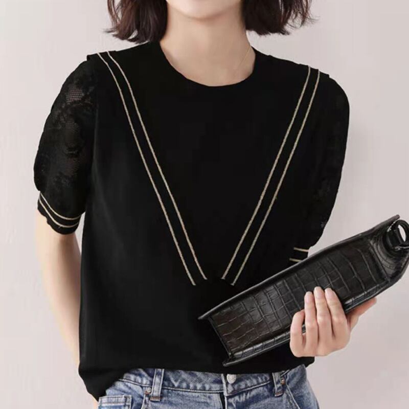 ニットトップス半袖アイス Tシャツ夏 Camisetas 中空黒 Tシャツ薄い Tシャツ ショート ブラック ハーフスリーブ サマー 夏物 シルク
