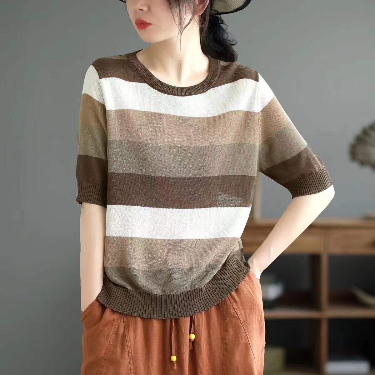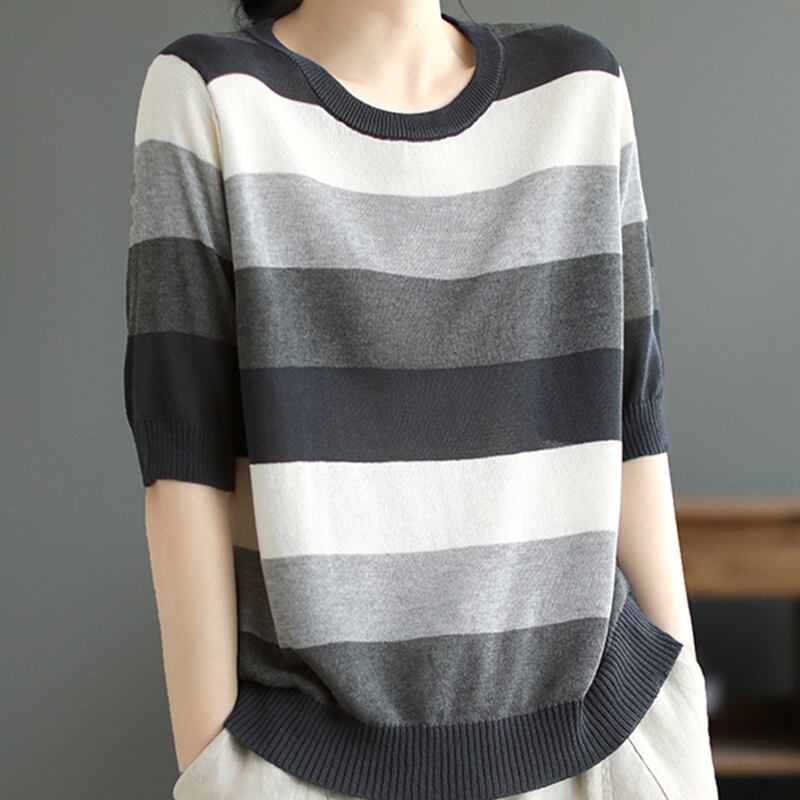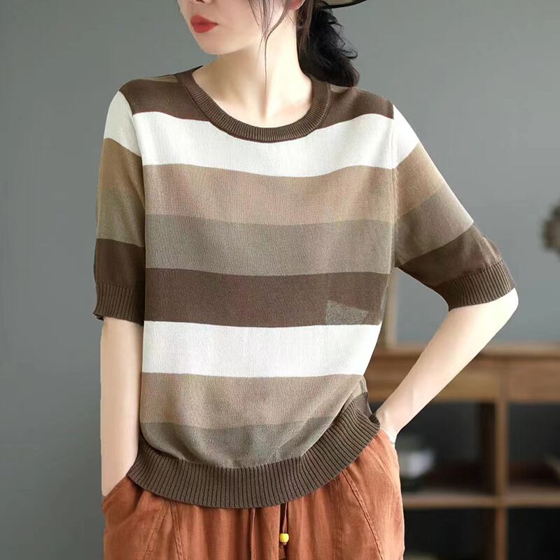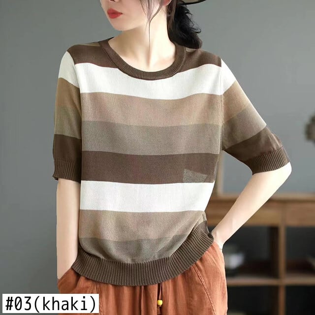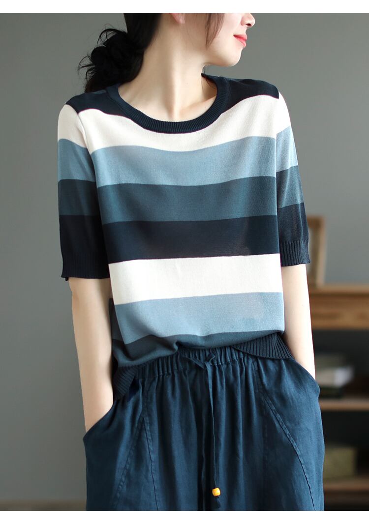 夏ストライプ Tシャツ O ネックニットトップス Tシャツ半袖 Tシャツルーズ服 Camisetas ショート ハーフスリーブ サマー 夏物 Oネック