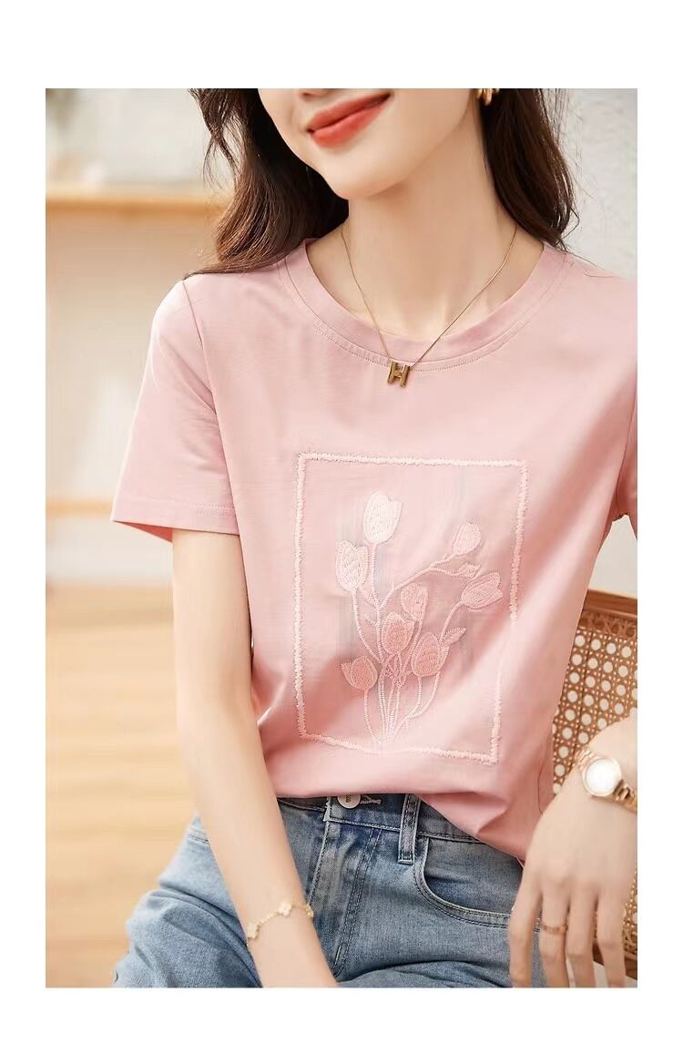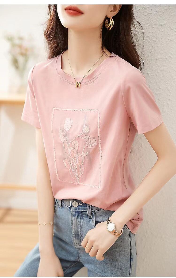夏ピンク Tシャツ半袖コットン Tシャツ花刺繍トップス O ネックルーズ Tシャツ ショート ハーフスリーブ サマー 夏物 花柄 Oネック