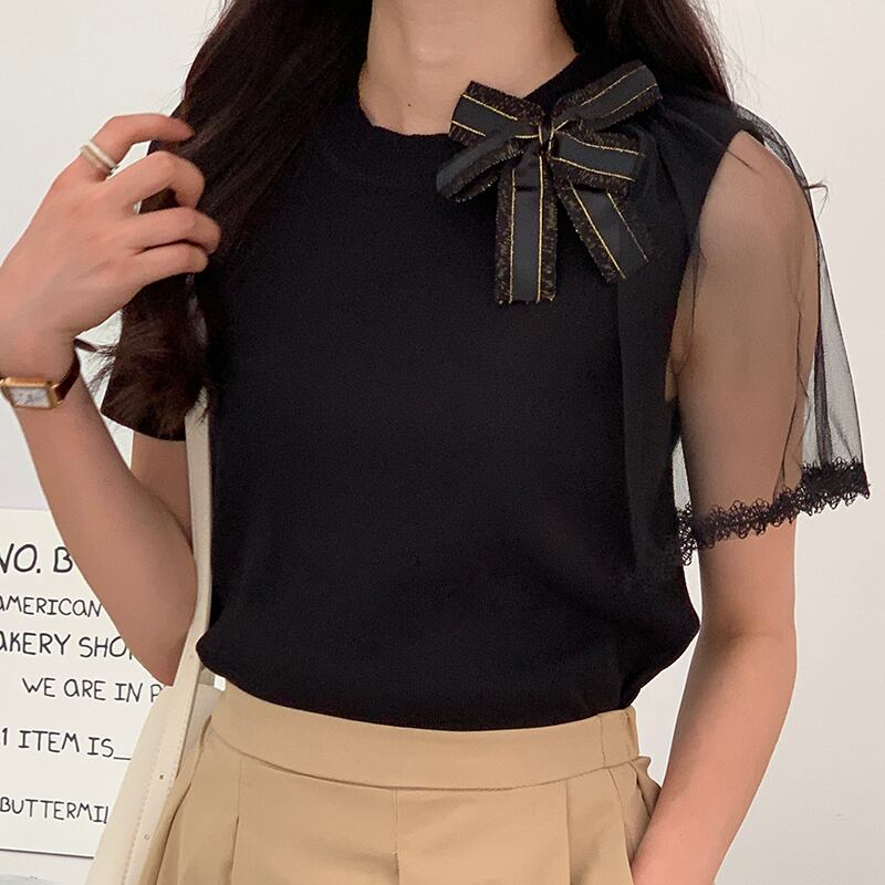 弓 Tシャツパッチワーク半袖 Tシャツ夏服黒ニットトップス Tシャツ ショート ブラック リボン ハーフスリーブ サマー 夏物