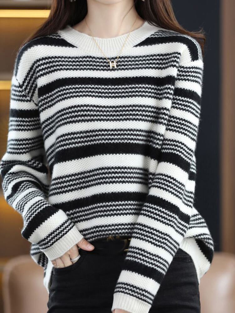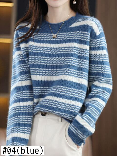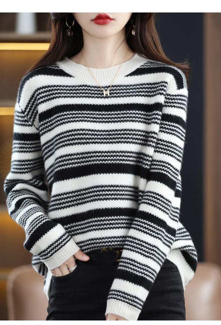 ストライプセーター秋冬 O ネック厚く暖かいセータールーズプルオーバーニットトップスプル オータム 秋物 ウィンター 冬物 Oネック