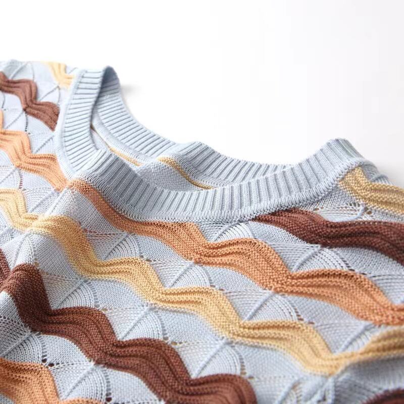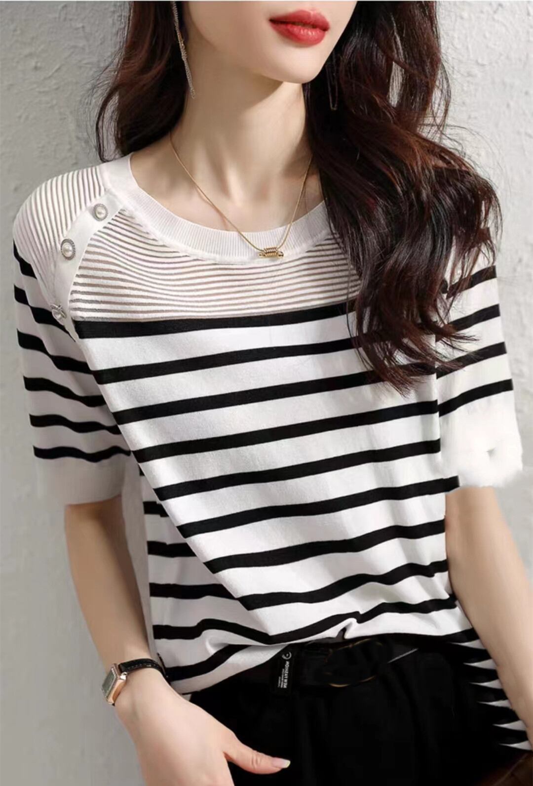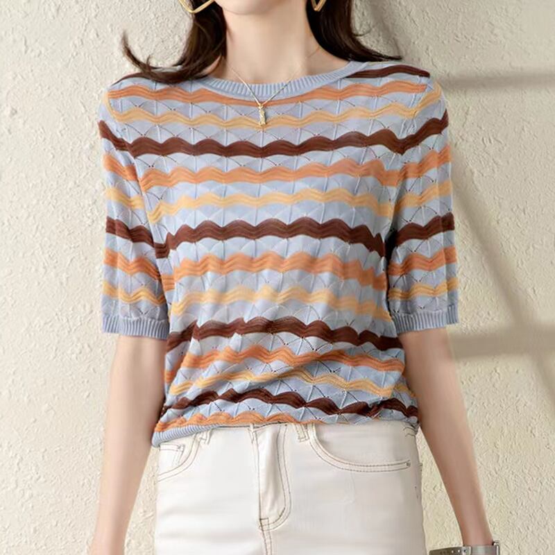 中空アウト半袖 Tシャツ服夏 Camisetas O ネックストライプ Tシャツニットトップス Tシャツ ショート ハーフスリーブ サマー 夏物 Oネック