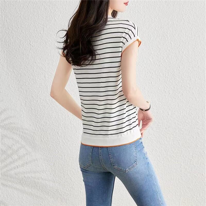 O ネックアイスルーズストライプ Tシャツ夏 Tシャツ半袖ニットトップス ショート ハーフスリーブ サマー 夏物 Oネック シルク
