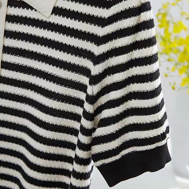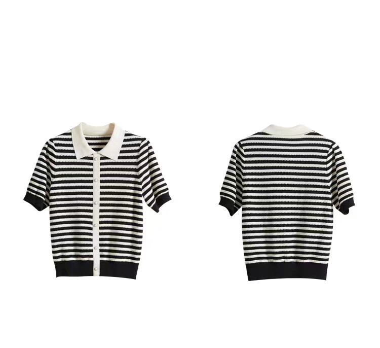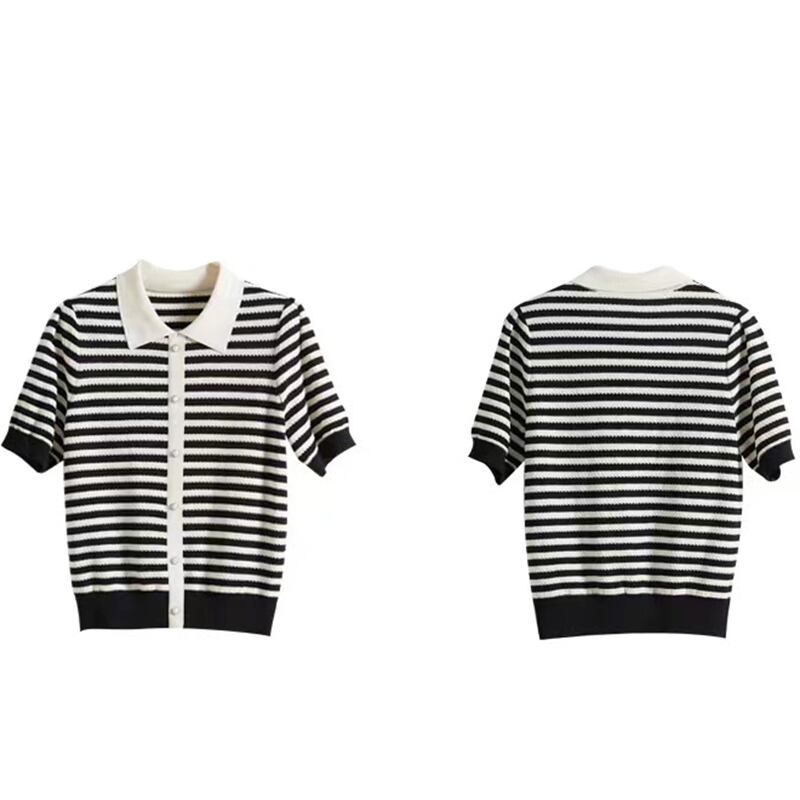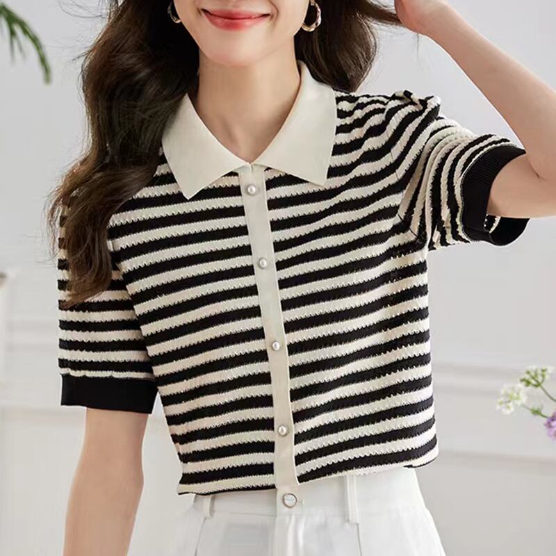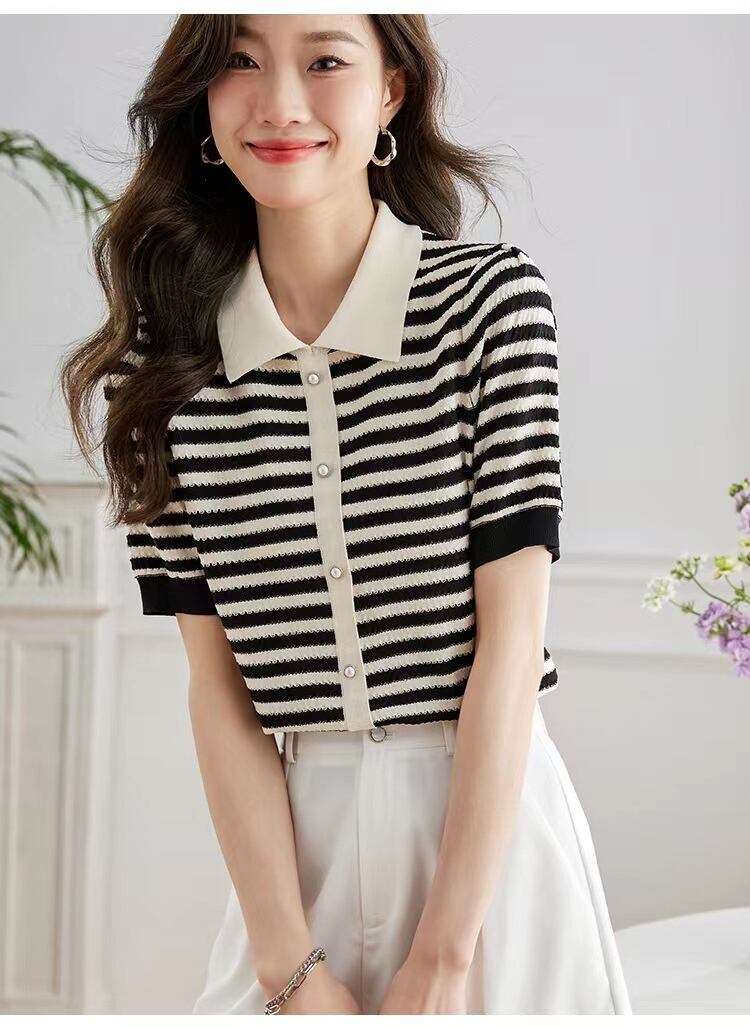 ターンダウン襟ストライプ Tシャツ半袖アイスルーズ Tシャツ夏 Tシャツニットトップス ショート ハーフスリーブ サマー 夏物 シルク