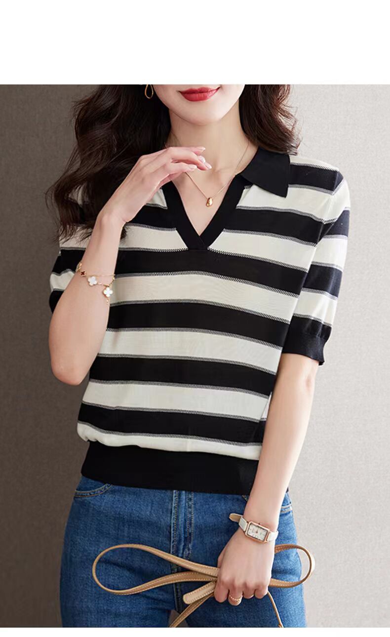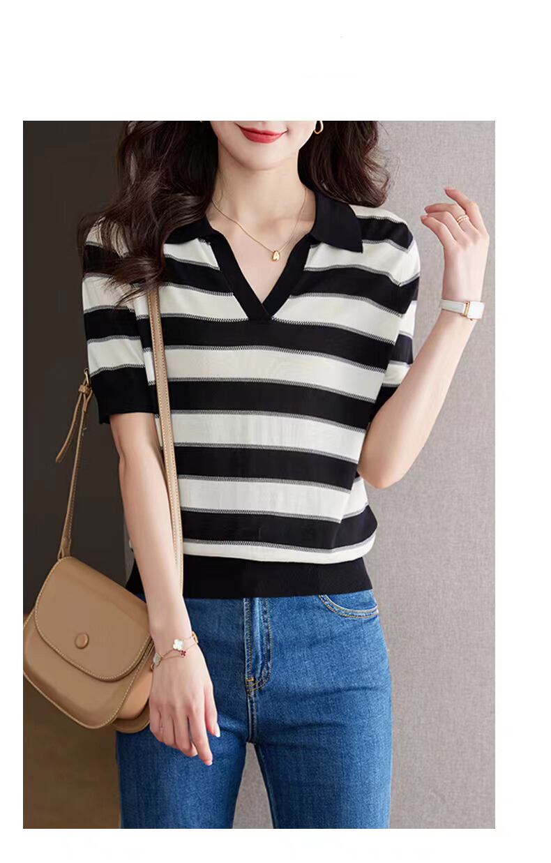 半袖 Tシャツ黒と白ストライプニットトップス夏 Tシャツターンダウン襟レディース ショート ホワイト ブラック ハーフスリーブ サマー 夏物