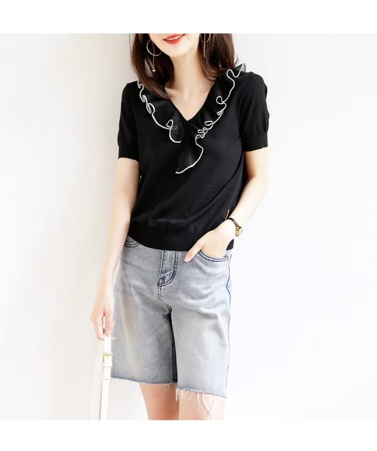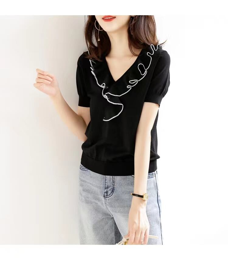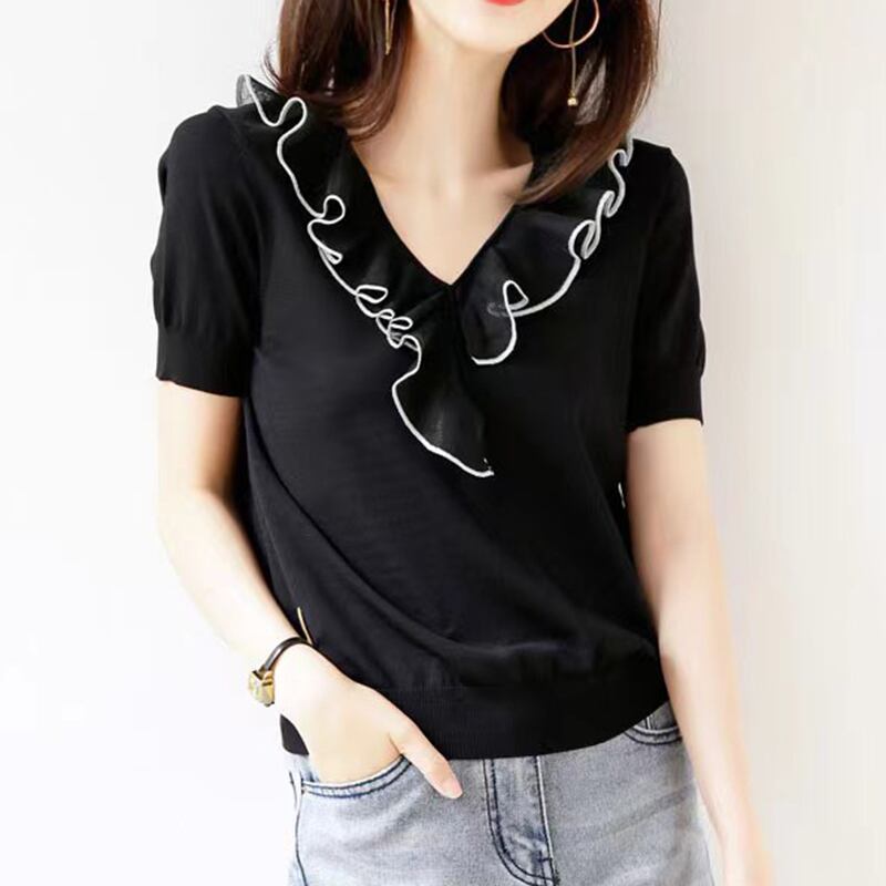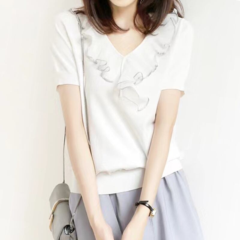 白黒 Tシャツニットトップス半袖ルーズ Tシャツ V ネック Tシャツ夏レディース ショート ホワイト ブラック ハーフスリーブ サマー 夏物 Vネック