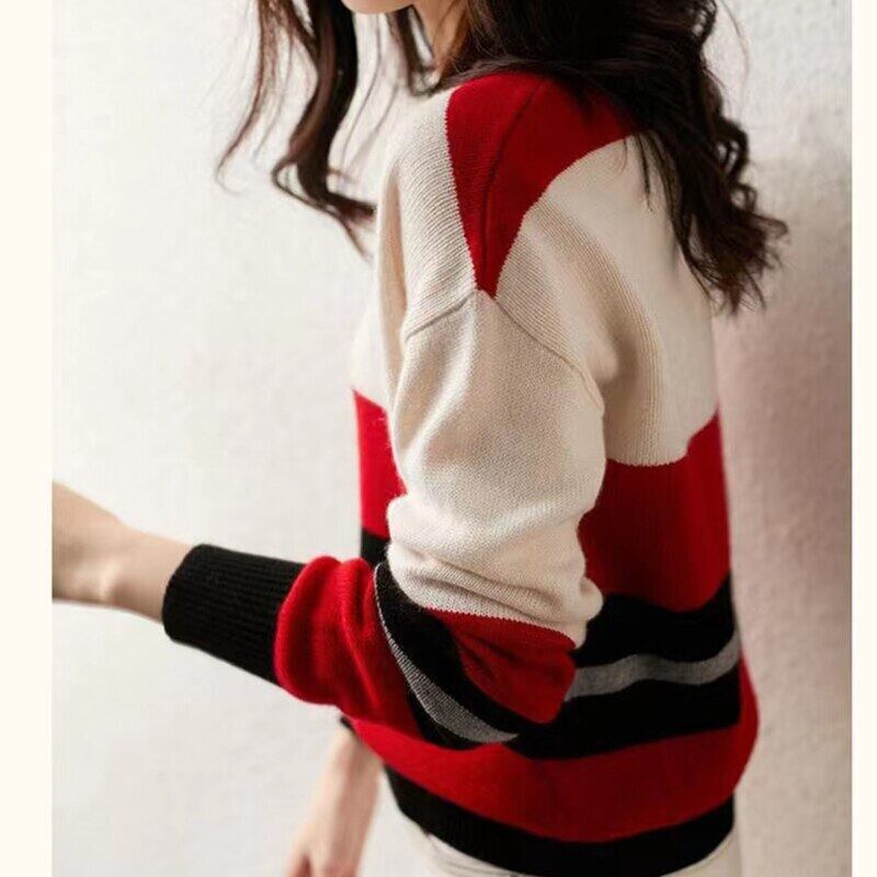 秋冬服ストライプ V ネックセーター長袖プルオーバーニットトップスニット ロング オータム 秋物 ウィンター 冬物 Vネック