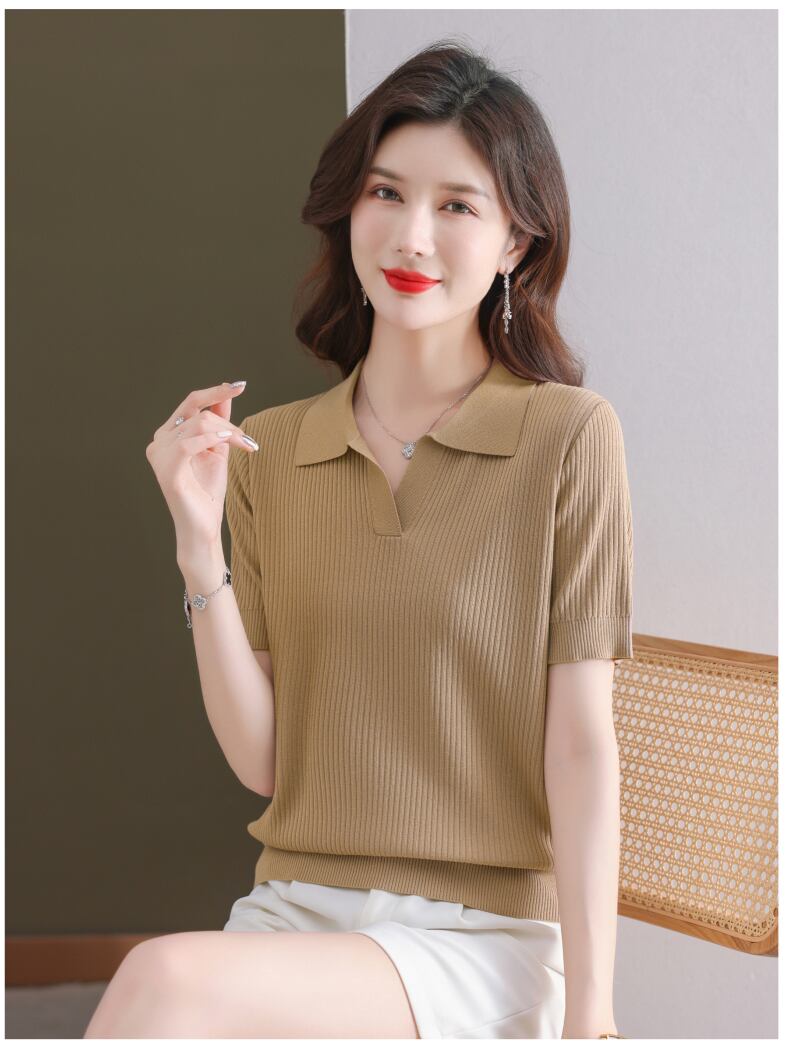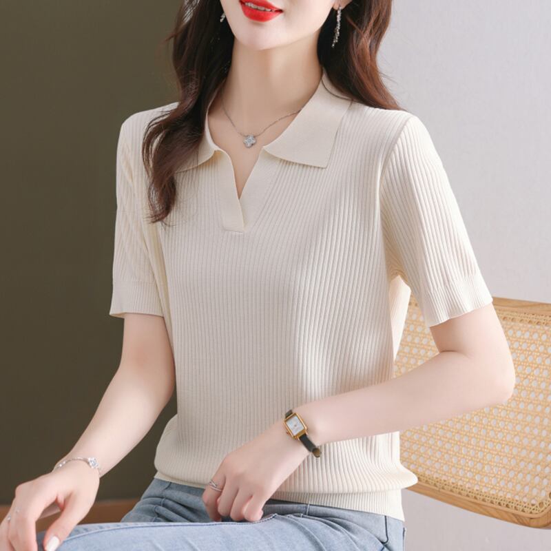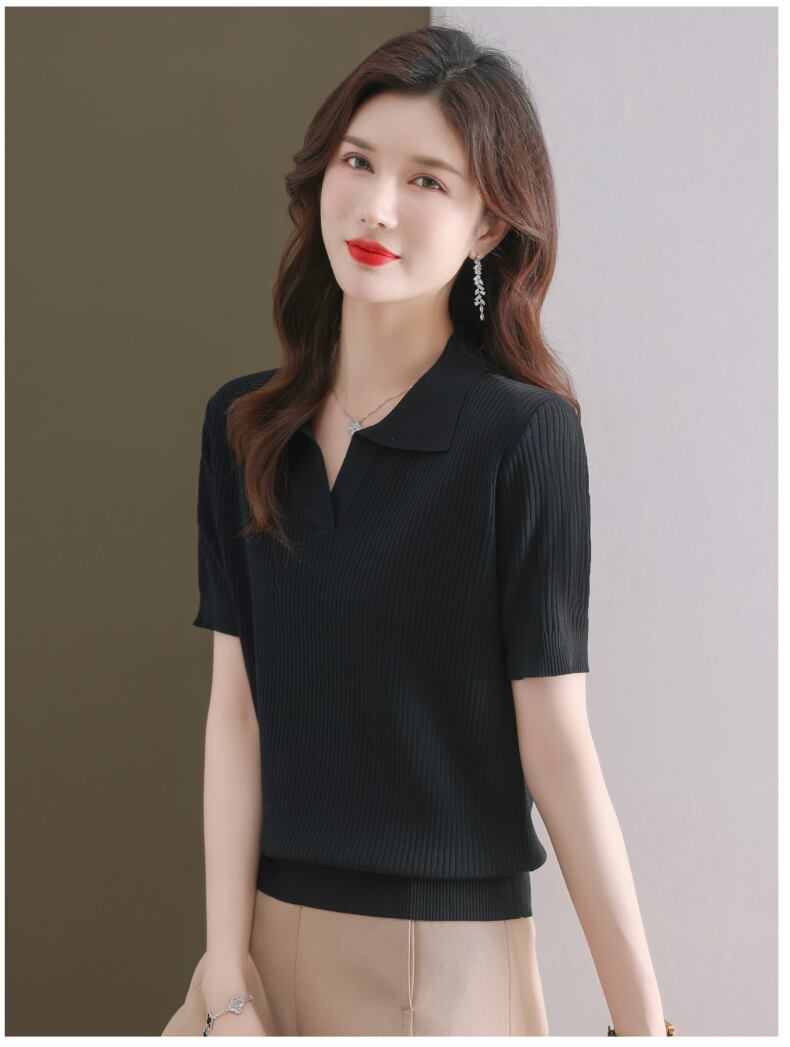 ターンダウン襟半袖 Tシャツ夏 Tシャツ黒ニットトップス薄い Tシャツ ショート ブラック ハーフスリーブ サマー 夏物 ソリッドカラー