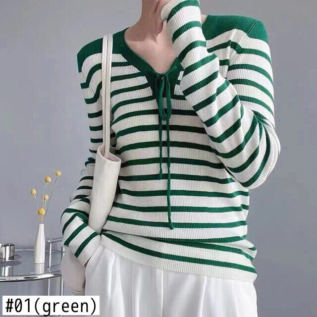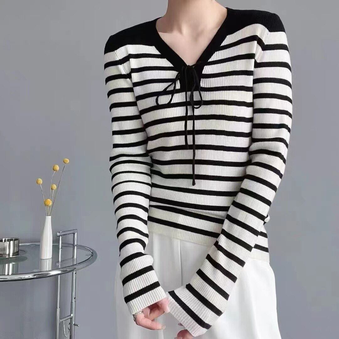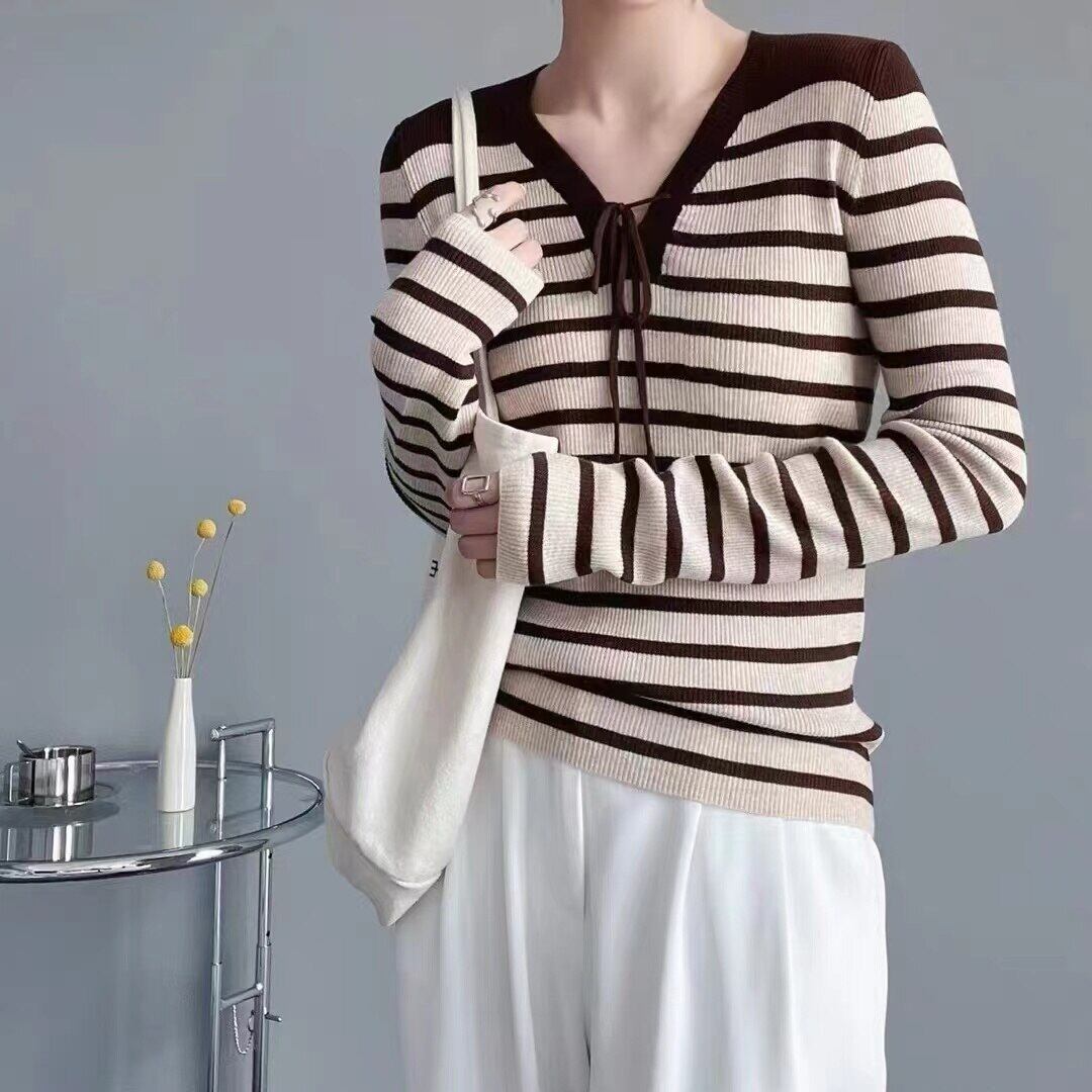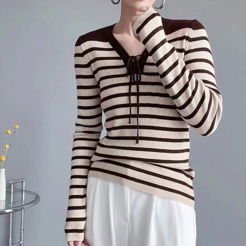 プル秋冬服ストライプ V ネックセータースリム長袖プルオーバーニットトップス ロング オータム 秋物 ウィンター 冬物 Vネック