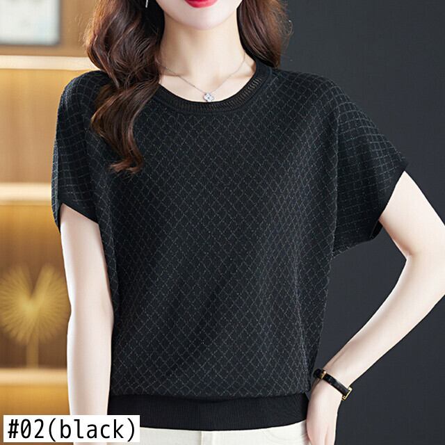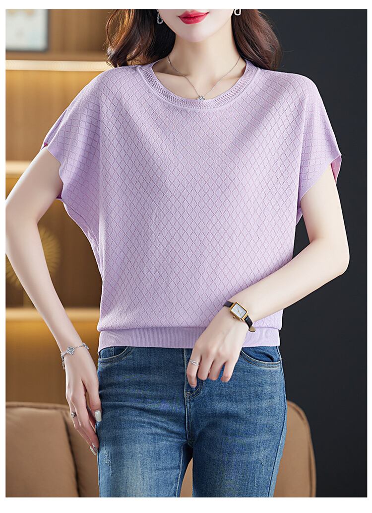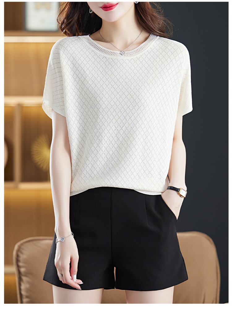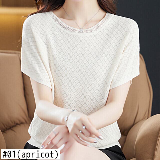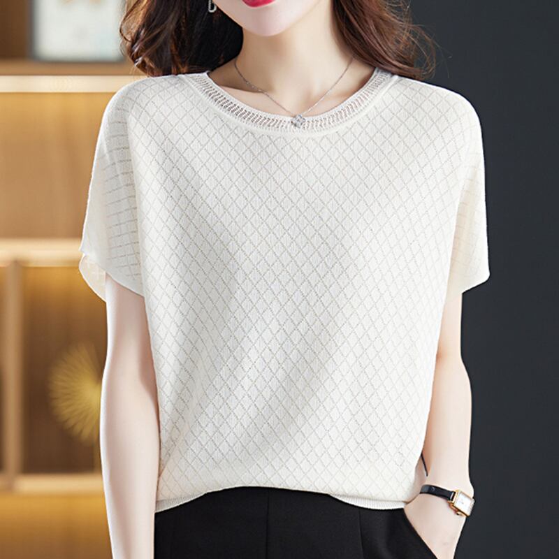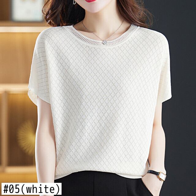 中空アウト Tシャツアイス半袖 Tシャツニット夏 O ネックニットトップス緩い薄い白 Tシャツ ショート ホワイト ハーフスリーブ サマー 夏物 Oネック シルク