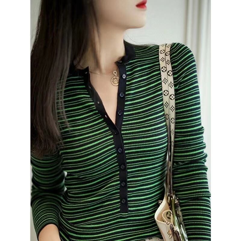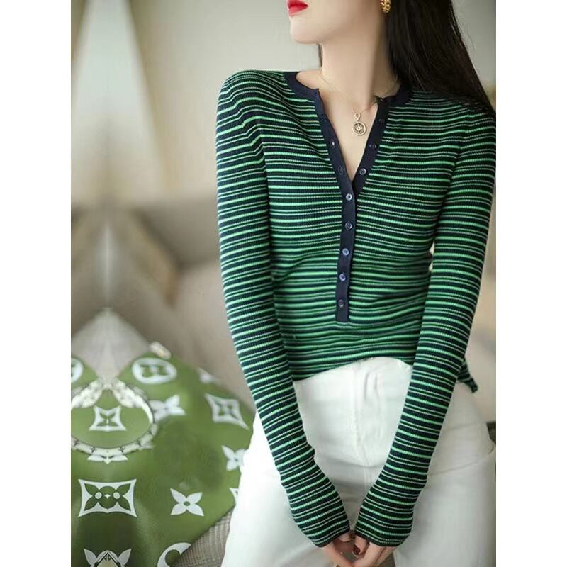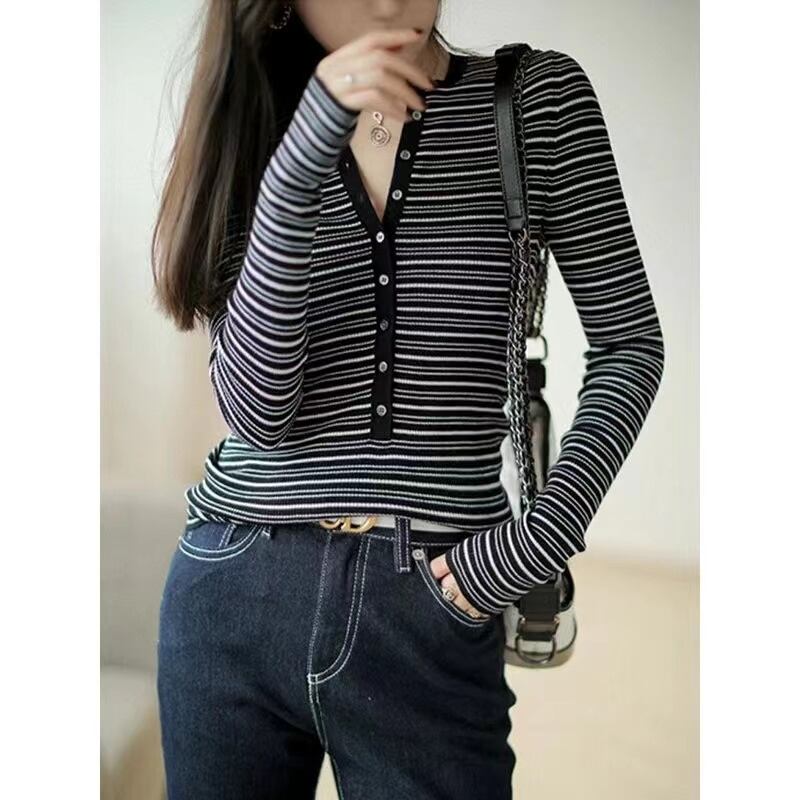 ストライプボタンセーター長袖ニットプルオーバー V ネックスリムトップ秋冬 ロング オータム 秋物 ウィンター 冬物 Vネック