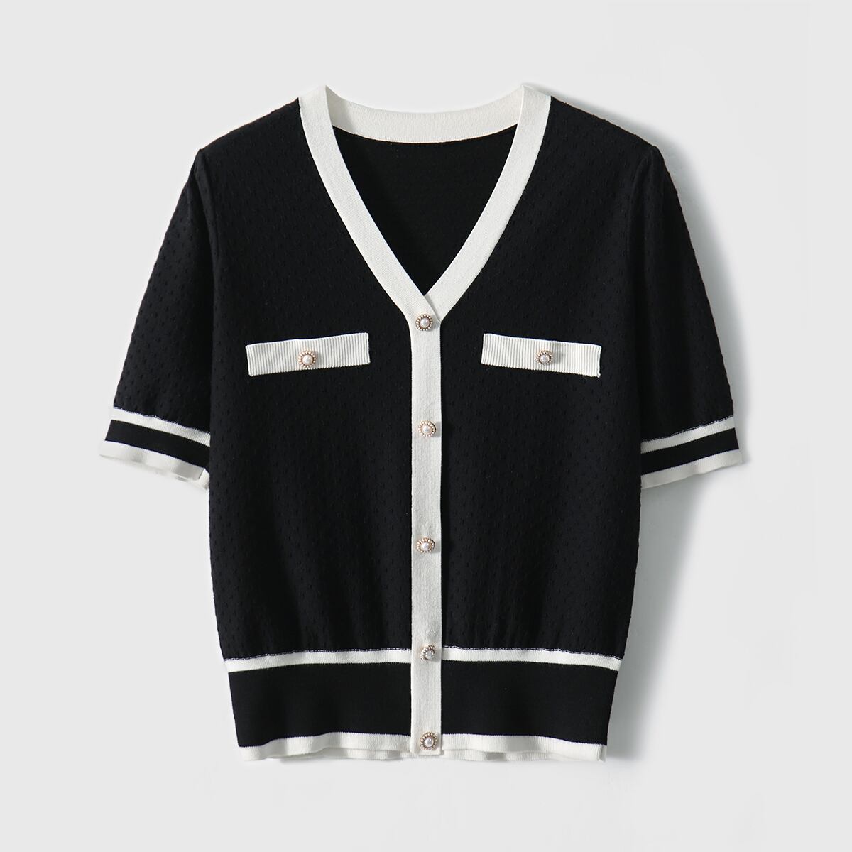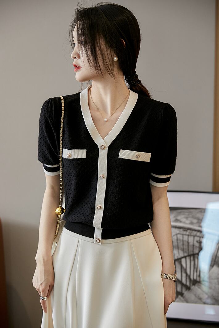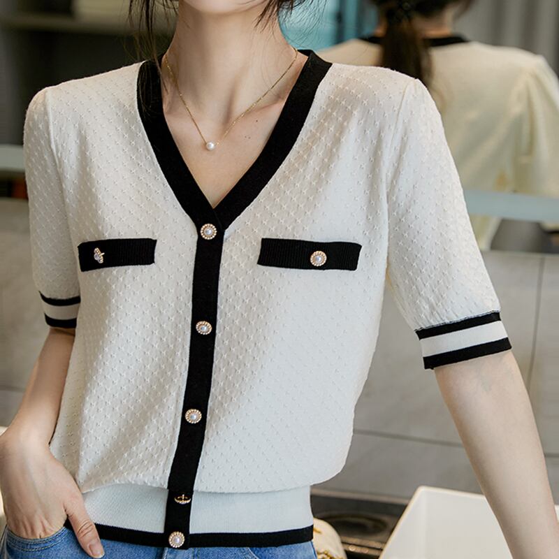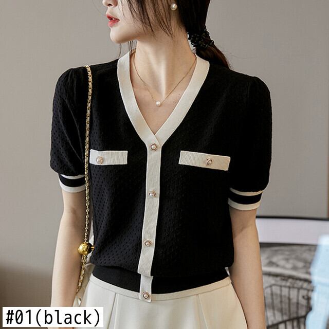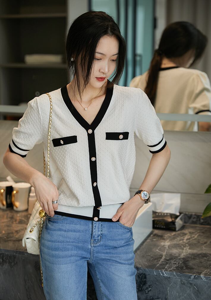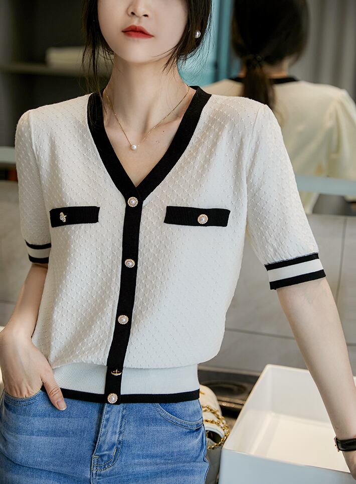Tシャツボタンアイスホワイト Tシャツ半袖 V ネックニットトップ Summe Tシャツ ショート ハーフスリーブ Vネック シルク