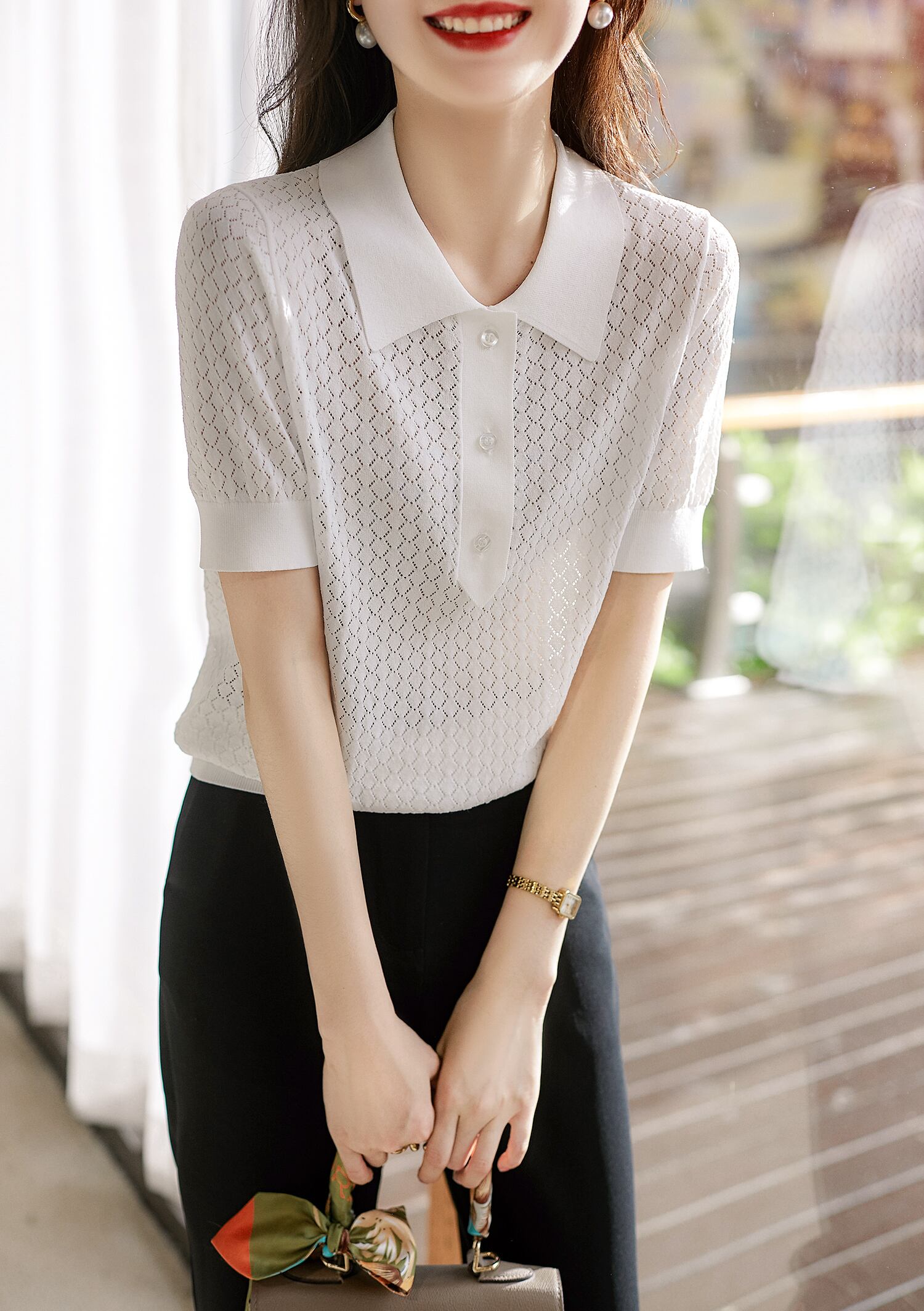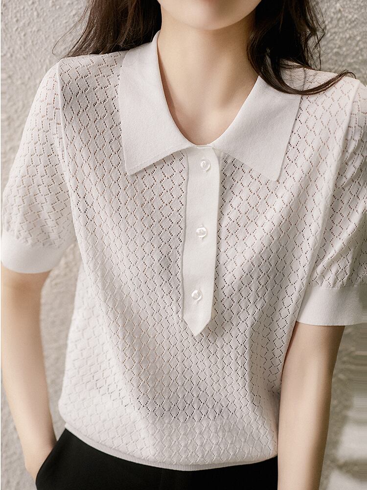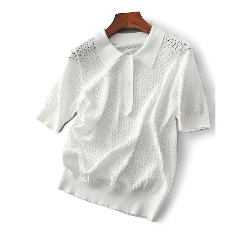 夏中空アウト薄型ニットトップ白 Tシャツ服半袖 Tシャツ Roupas s ショート ホワイト ハーフスリーブ サマー 夏物