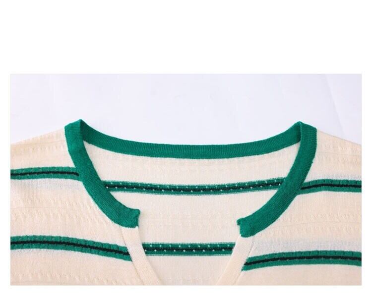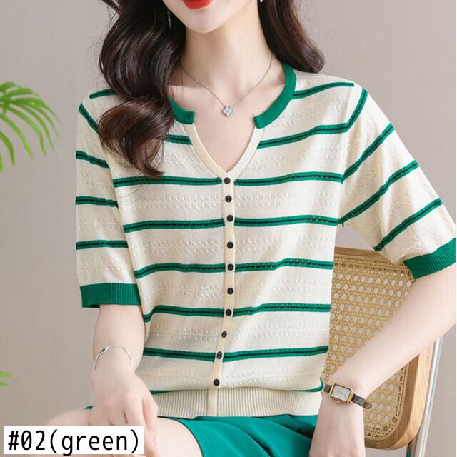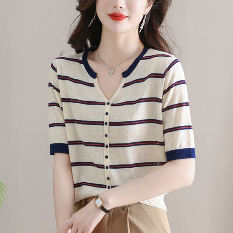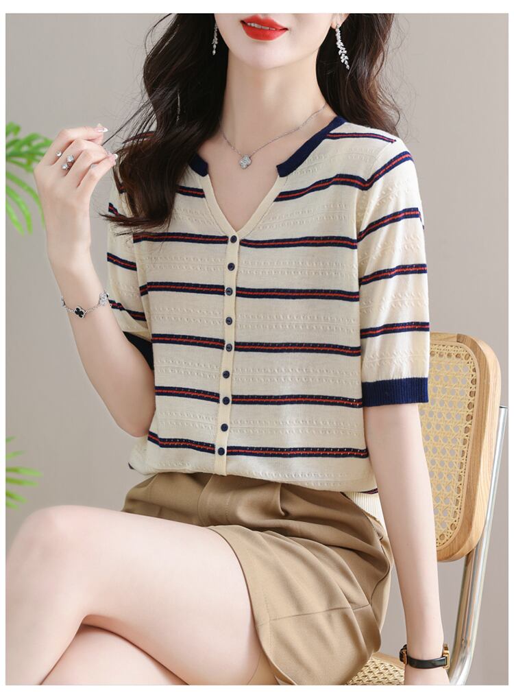 夏薄い Tシャツルーズ半袖 Tシャツ V ネックアイスストライプニットトップスボタン Tシャツ Ropa デ ショート ハーフスリーブ サマー 夏物 Vネック シルク