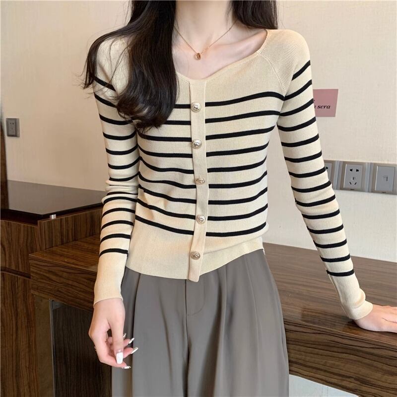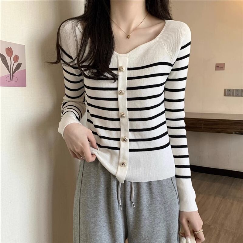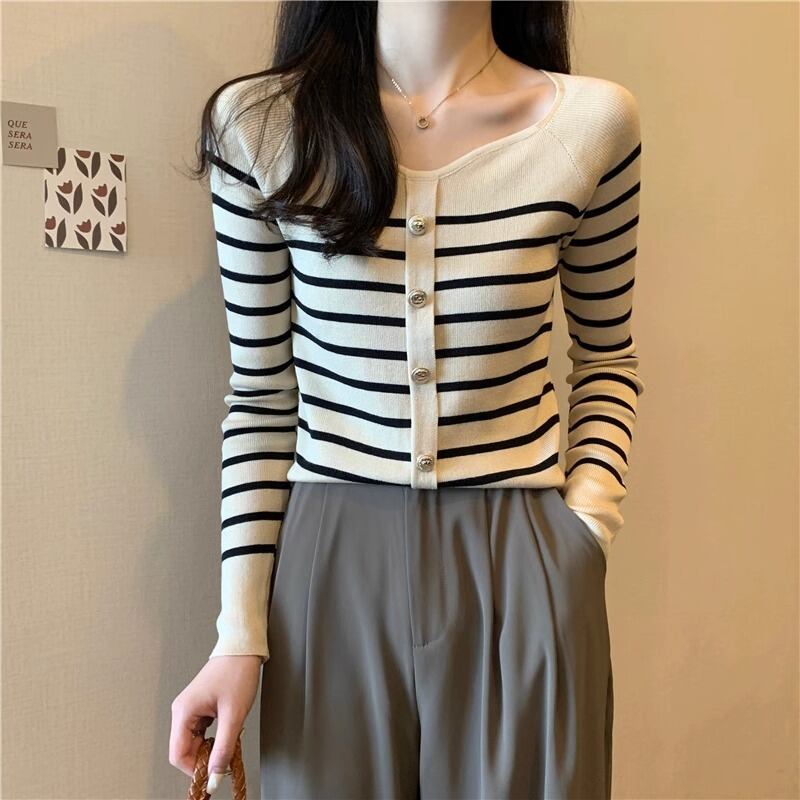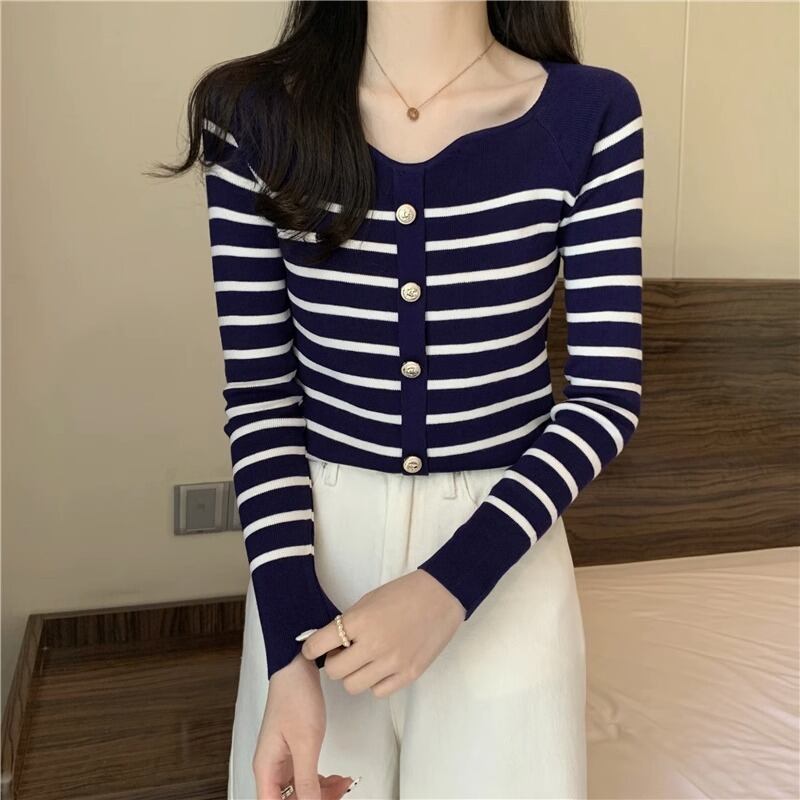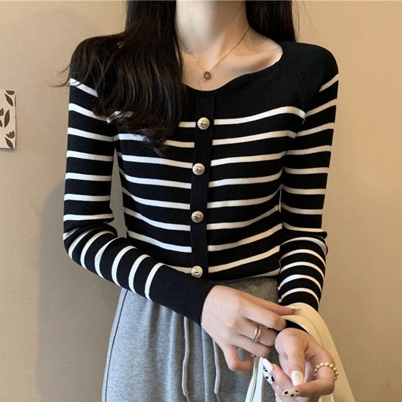 秋冬プルストライプボタンセーター長袖ニットプルオーバースリムクロップトップ ロング オータム 秋物 ウィンター 冬物