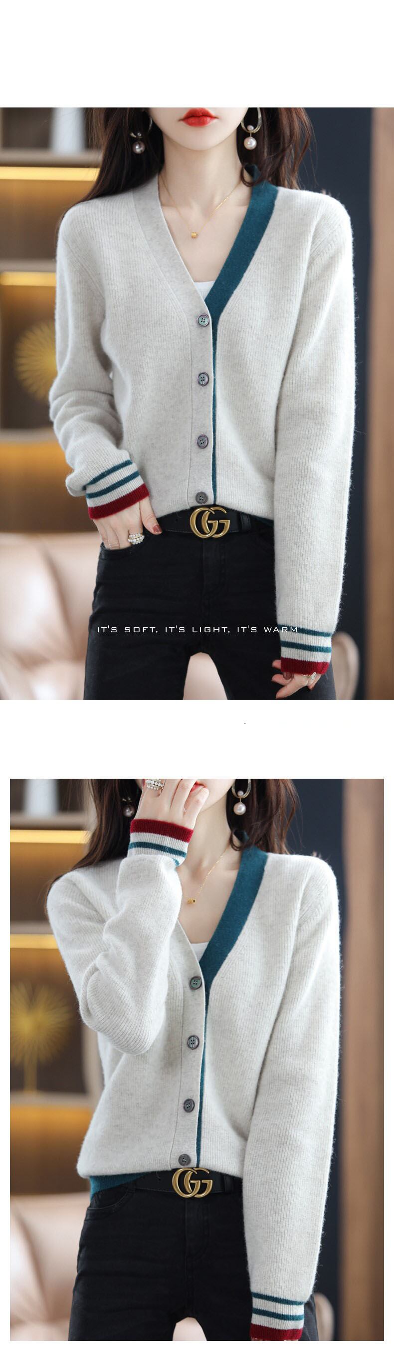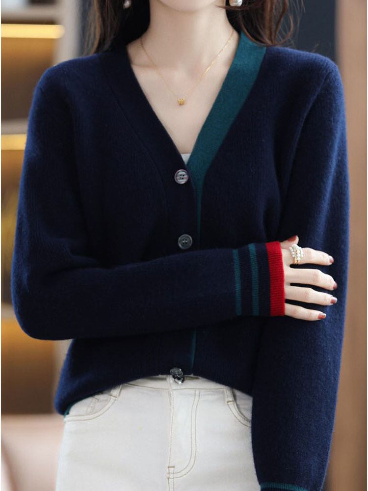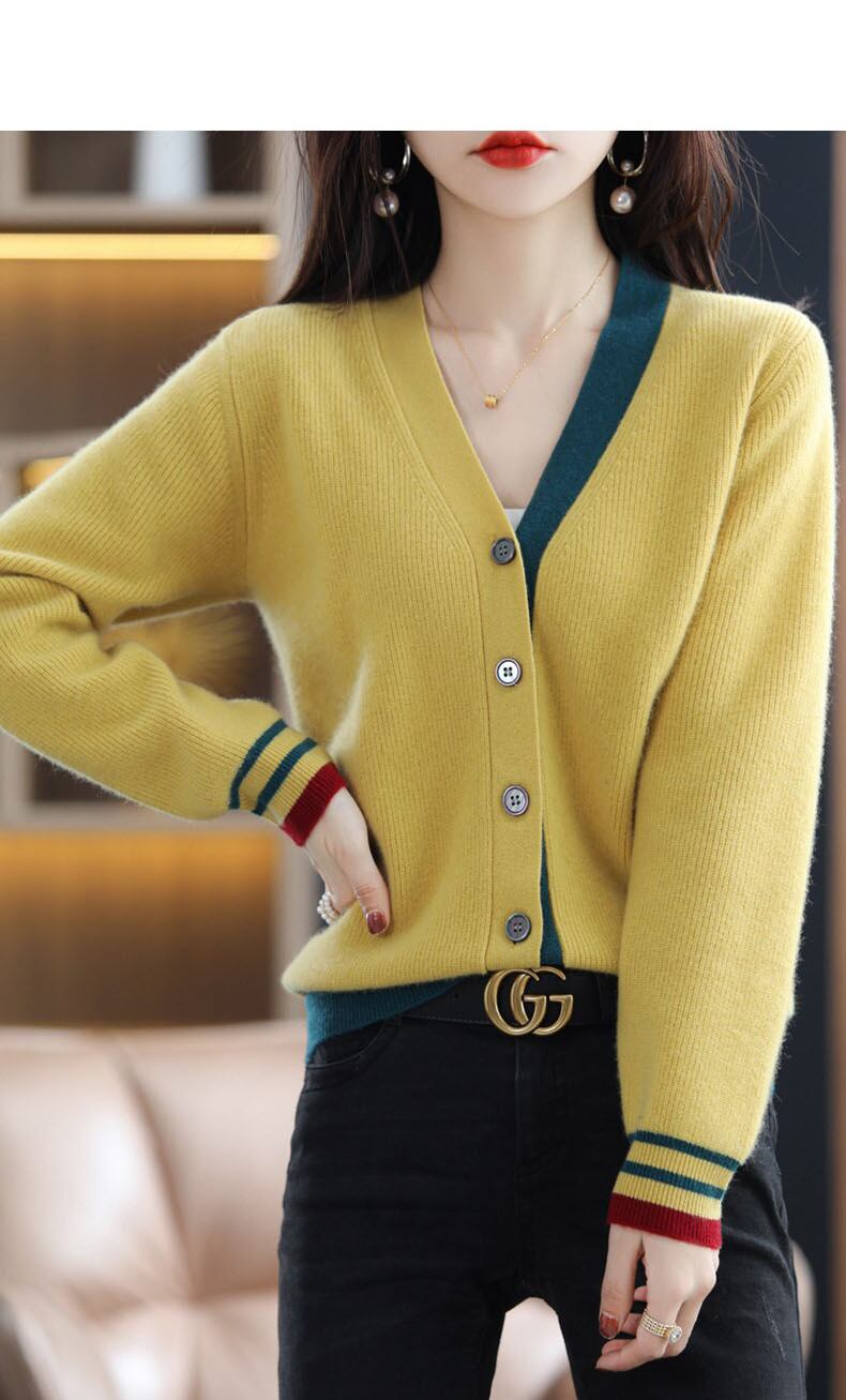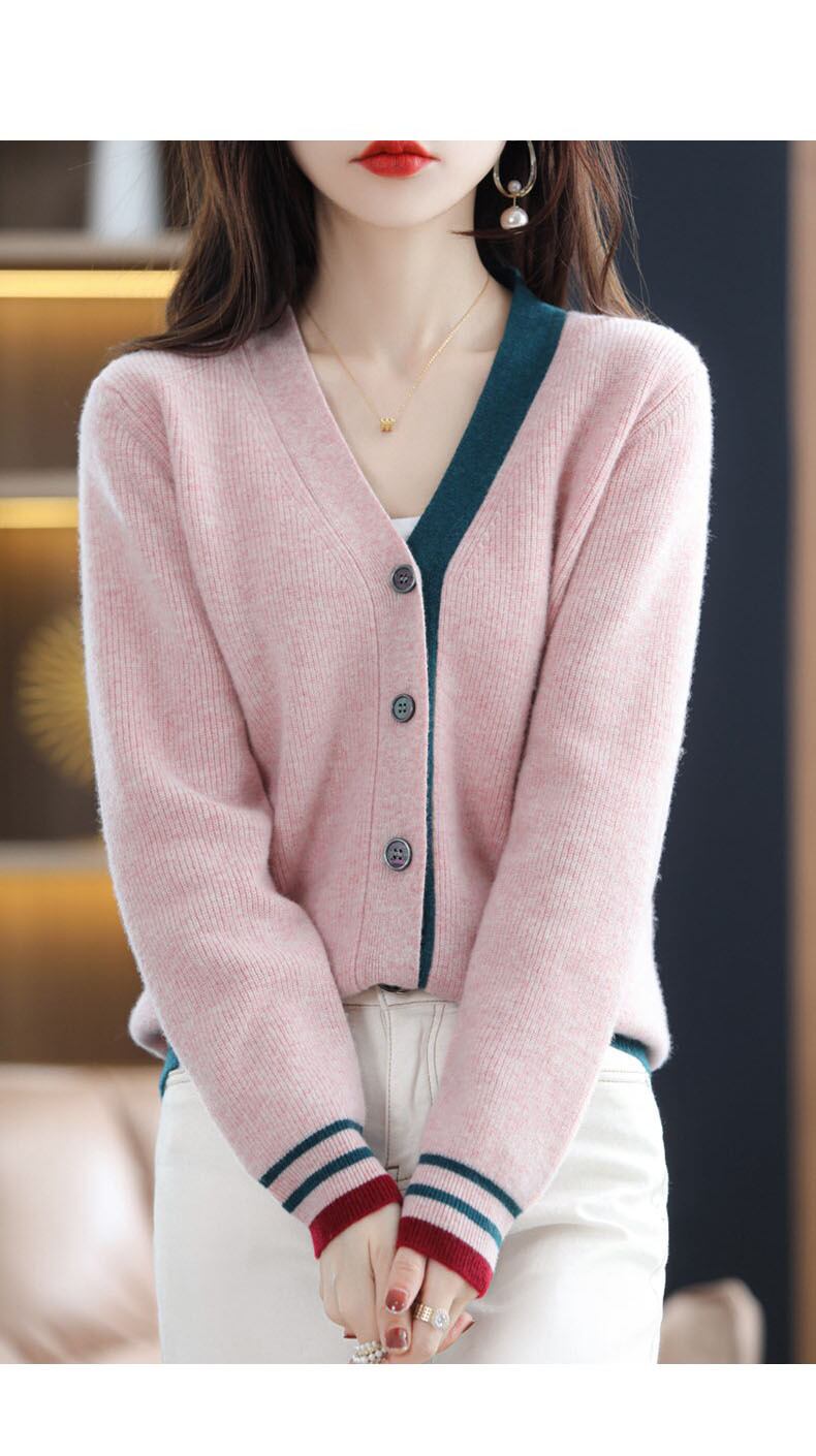 秋冬レディースコントラストカラーカーディガン V ネックニットトップス長袖セーター ロング オータム 秋物 ウィンター 冬物 Vネック