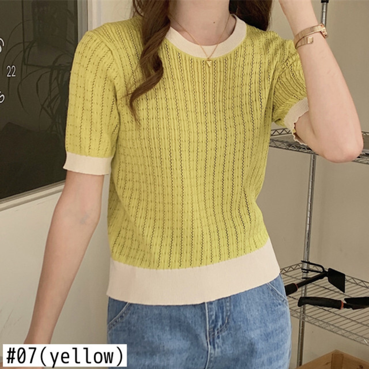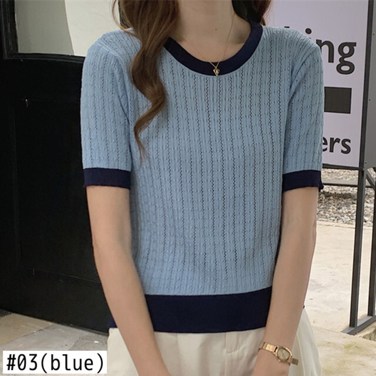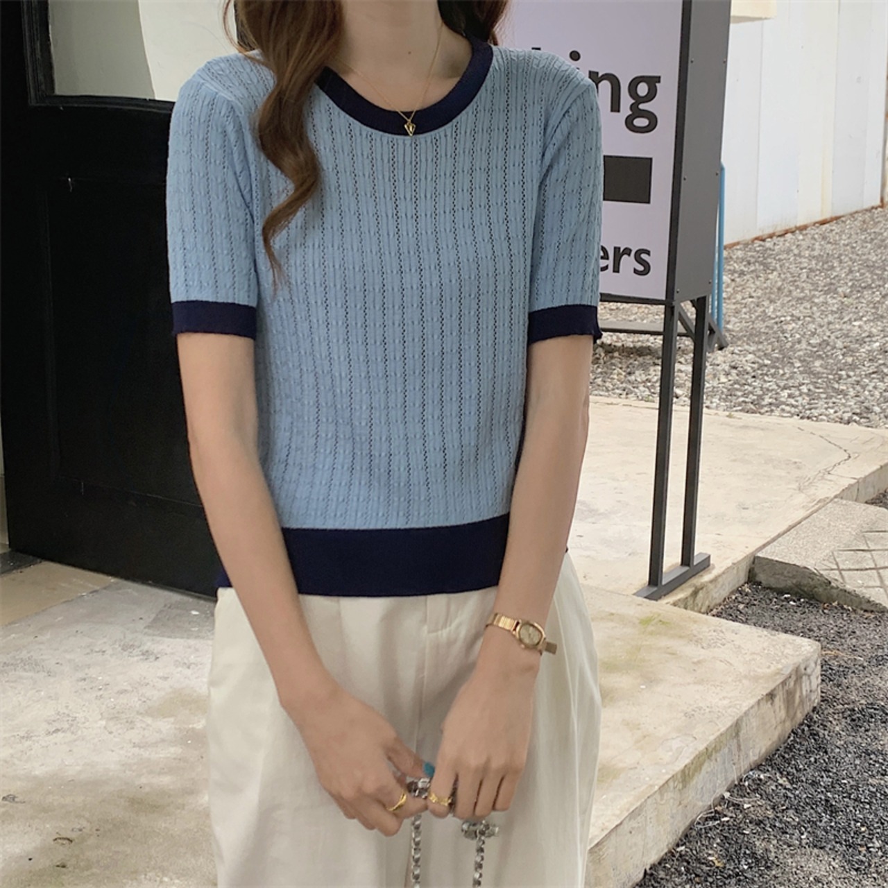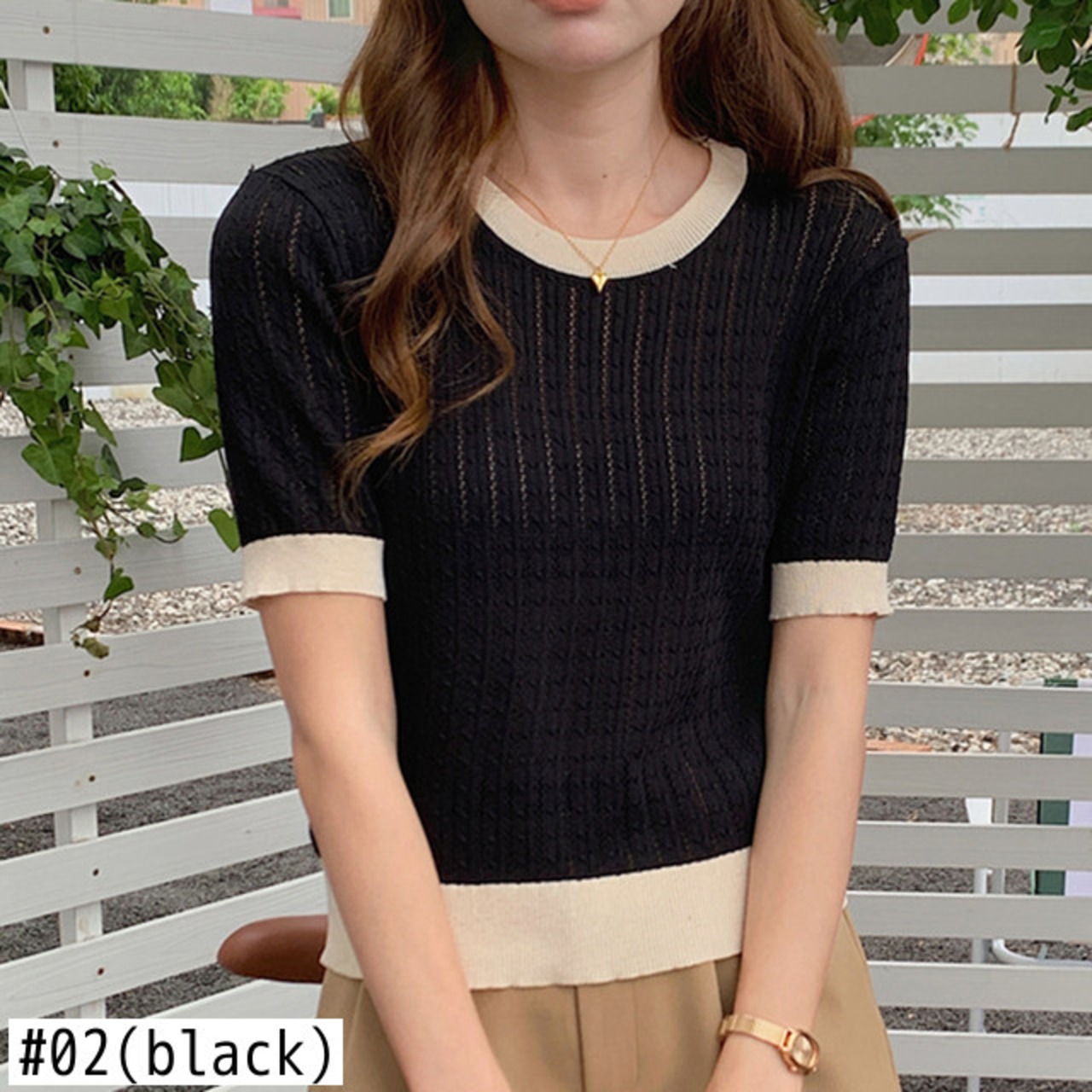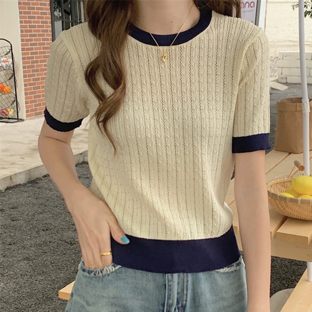 夏コントラストカラー半袖 Tシャツ O ネックニットクロップトップス中空アウト Tシャツ Ropa デ ショート ハーフスリーブ サマー 夏物 Oネック