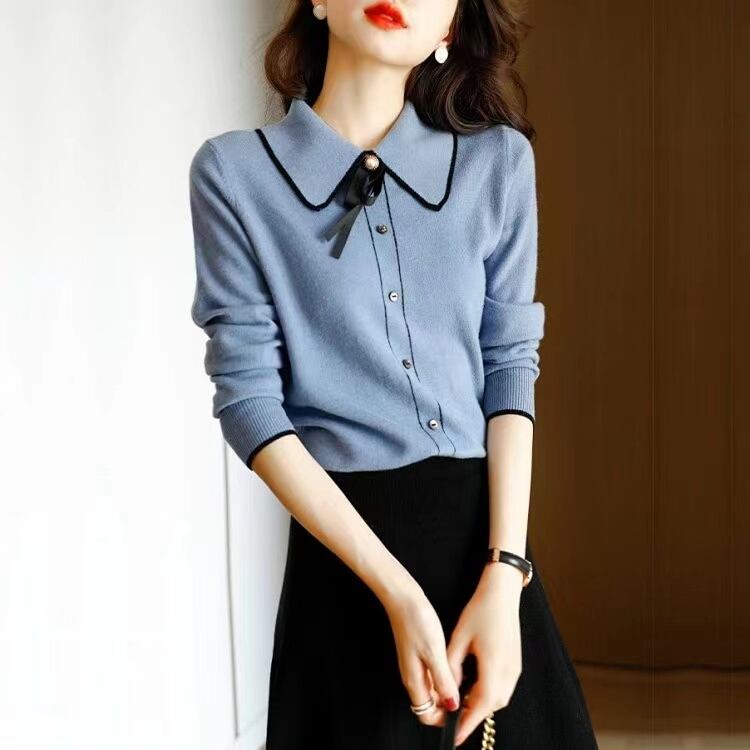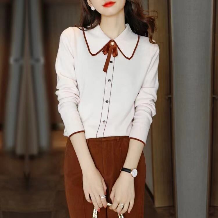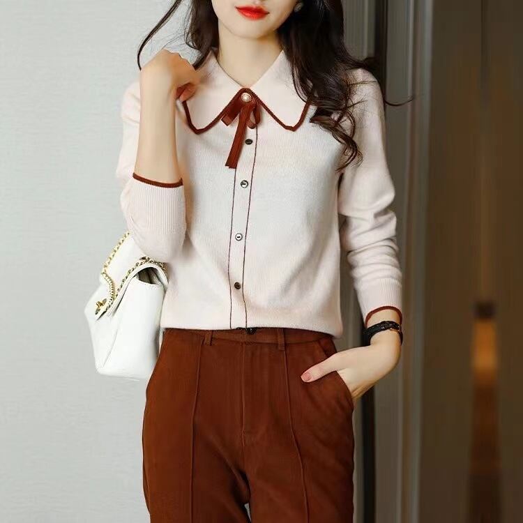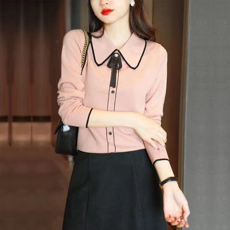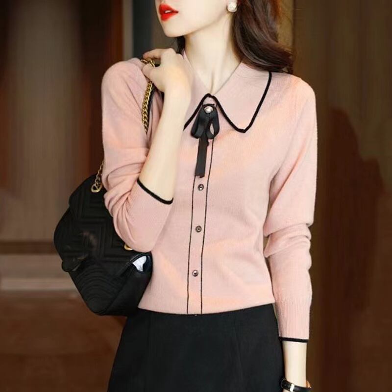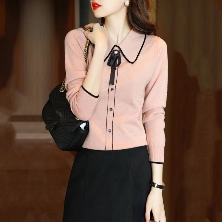 スタイルターンダウン襟ピンクスウェット秋冬服レディース長袖ルーズニットトップス ロング オータム 秋物 ウィンター 冬物