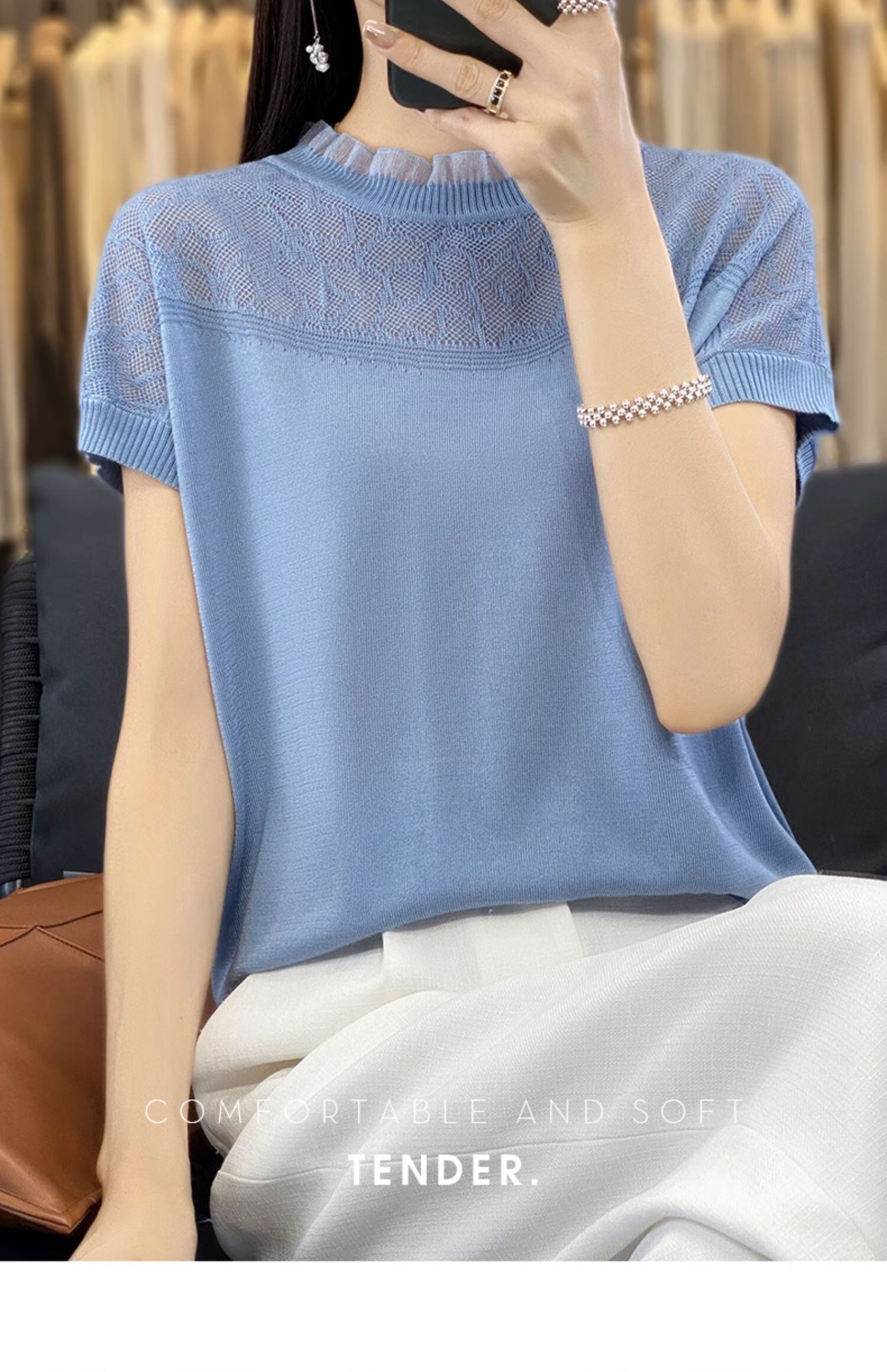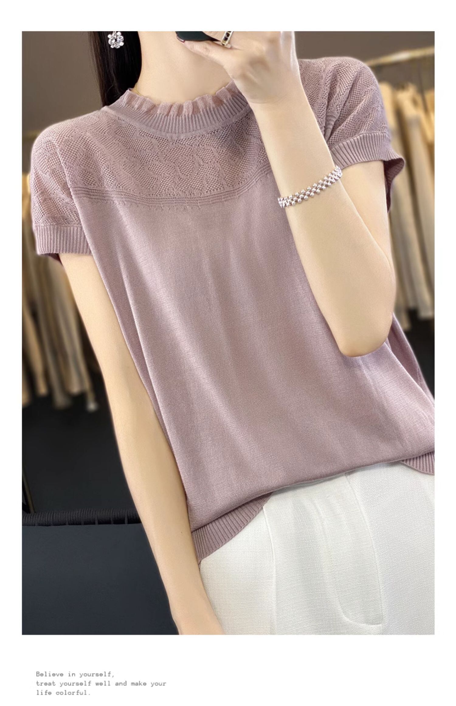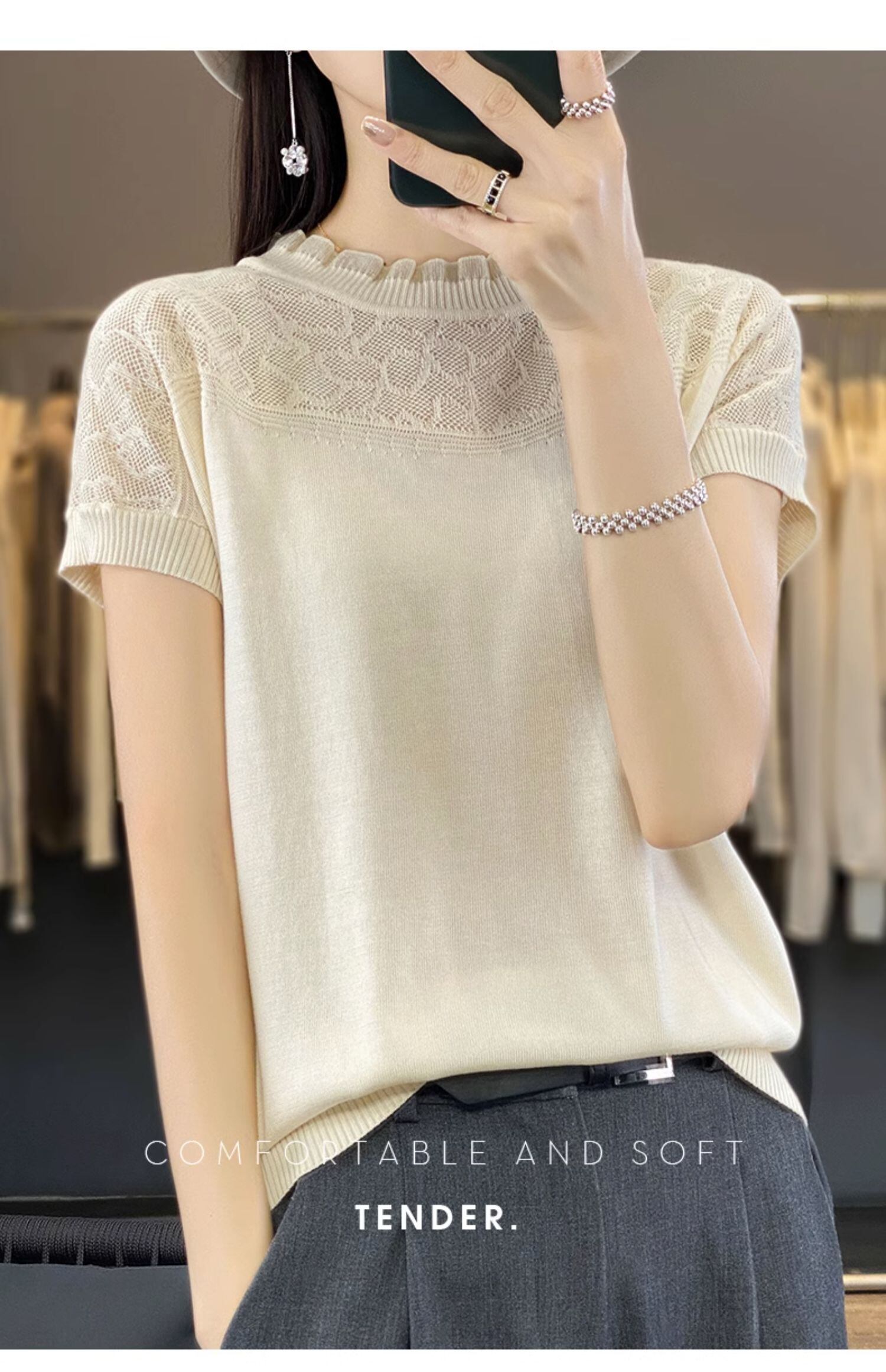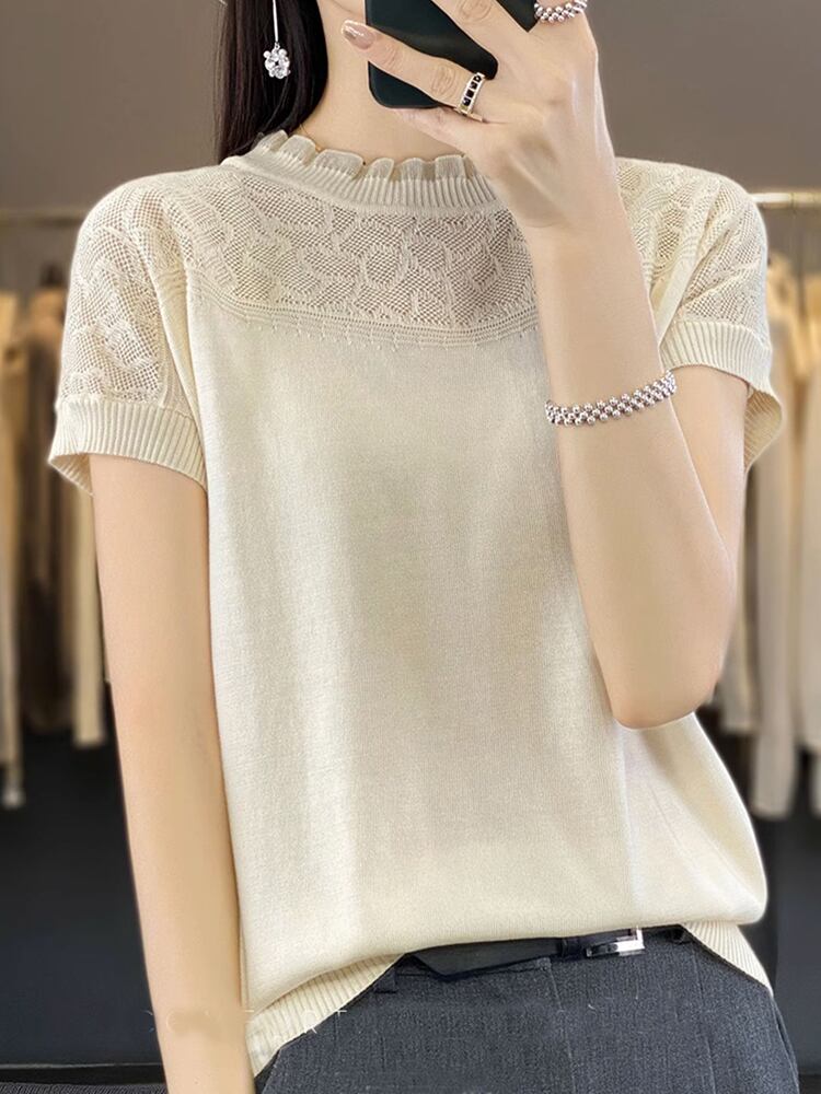 スタイル O ネック Tシャツ半袖 Tシャツ黒ニットトップス中空アウト Tシャツ夏 ショート ブラック ハーフスリーブ サマー 夏物 Oネック
