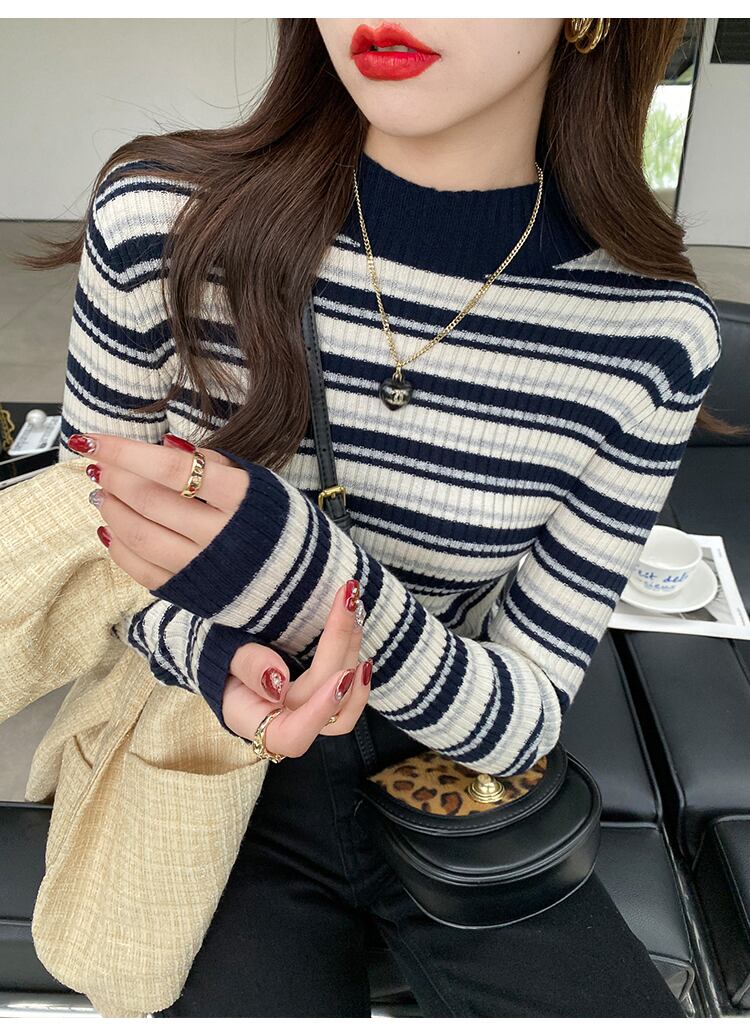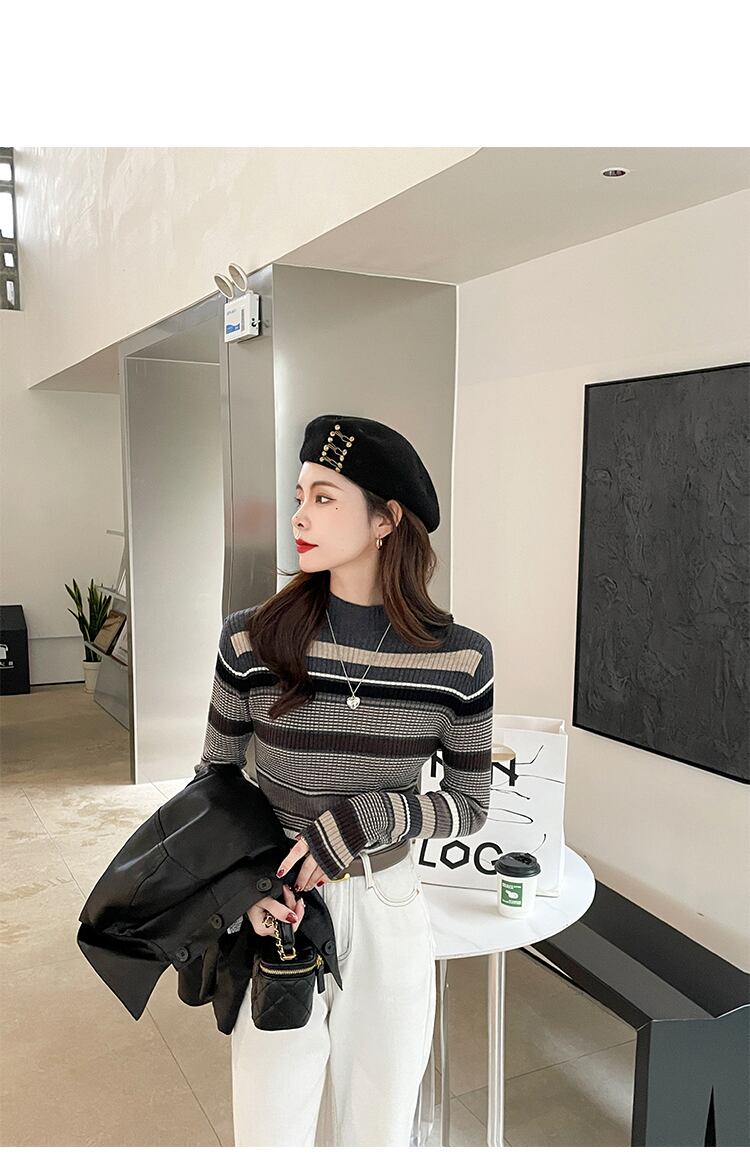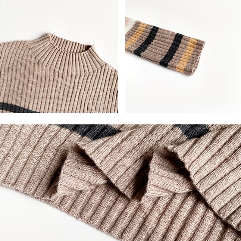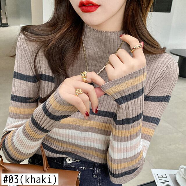 半襟ストライプセーター長袖プルオーバーニットトップススリムセーター秋冬レディース ロング オータム 秋物 ウィンター 冬物
