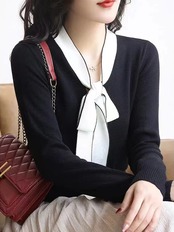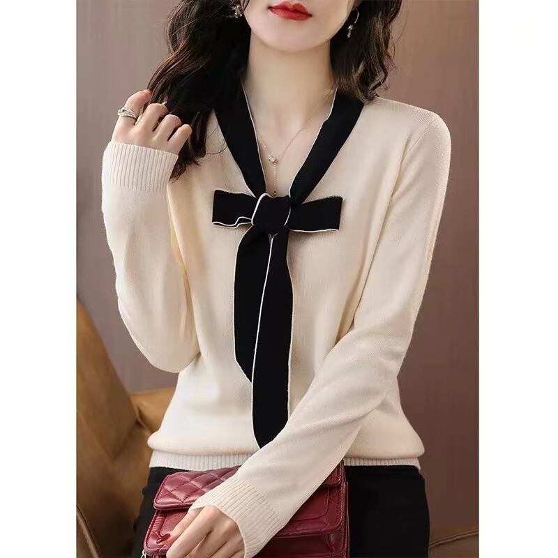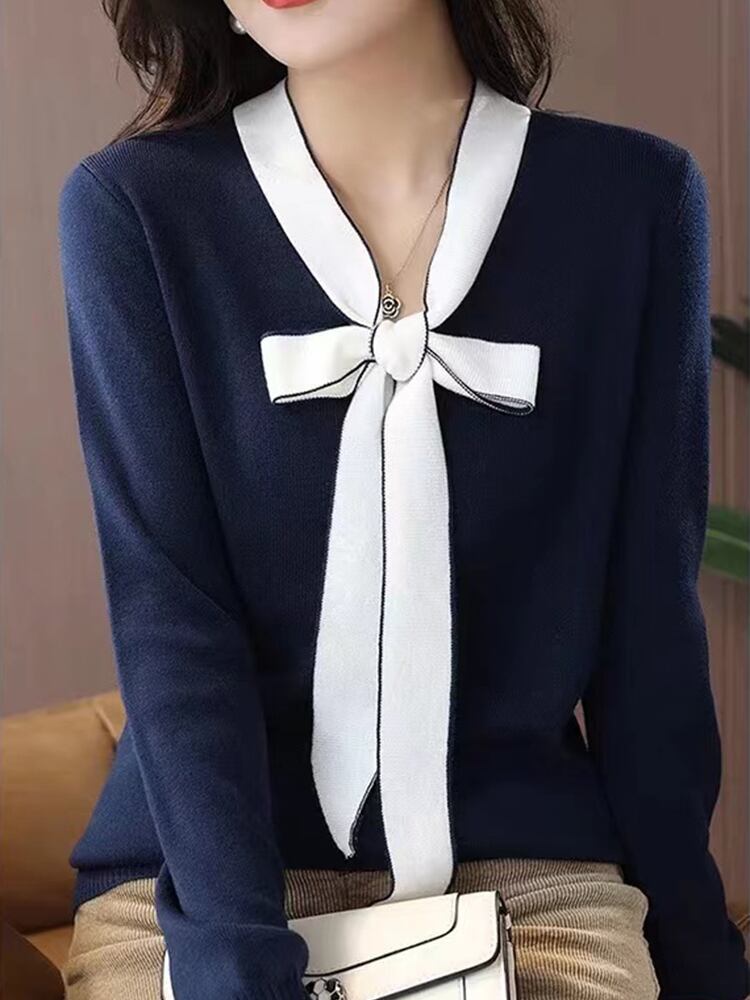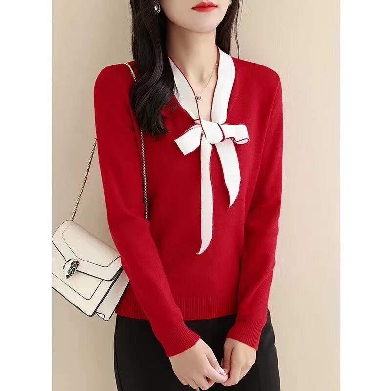 セーターズ デ モーダ冬服ボウ V ネックニットトップ長袖プルオーバーセーター ロング リボン ウィンター 冬物 Vネック