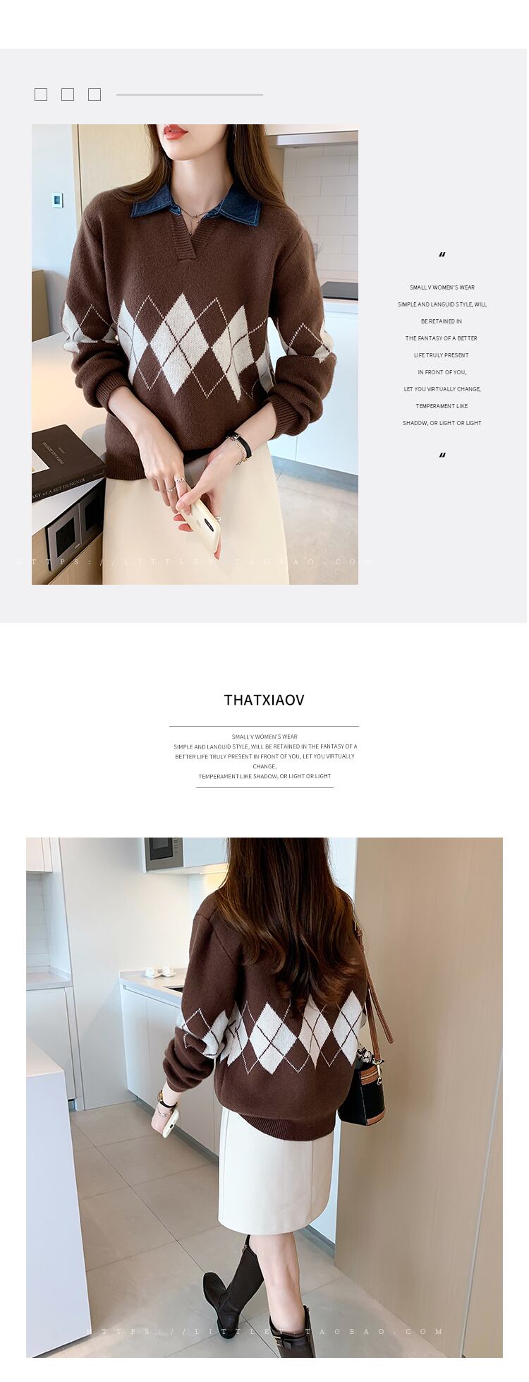 チェック柄プルオーバーセーターパッチワーク長袖ルーズ服秋冬ターンダウン襟厚いニットトップ ロング オータム 秋物 ウィンター 冬物