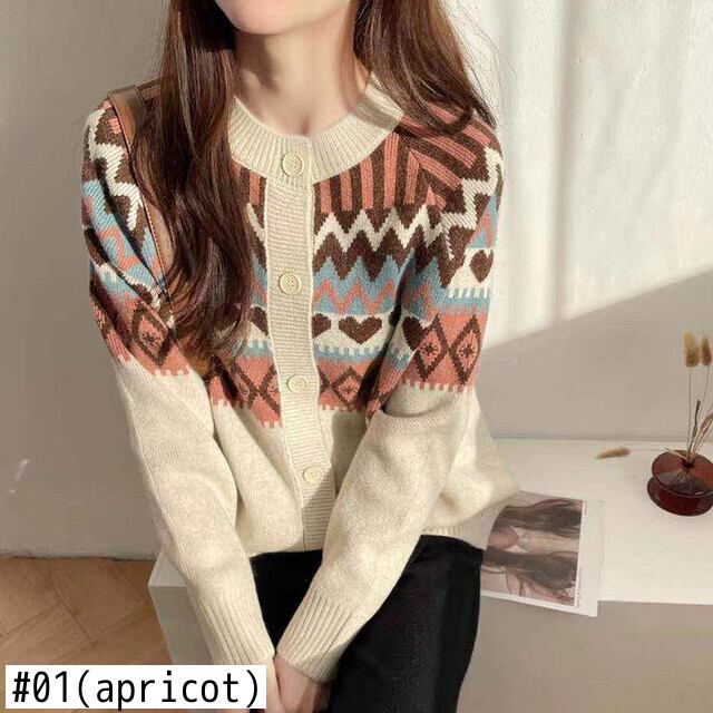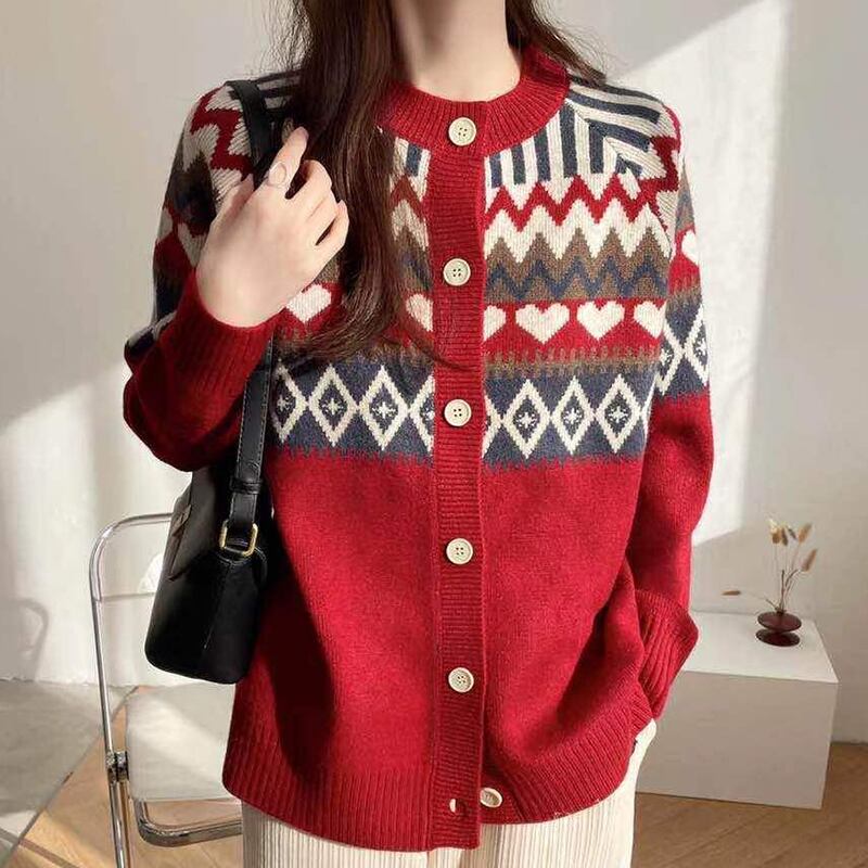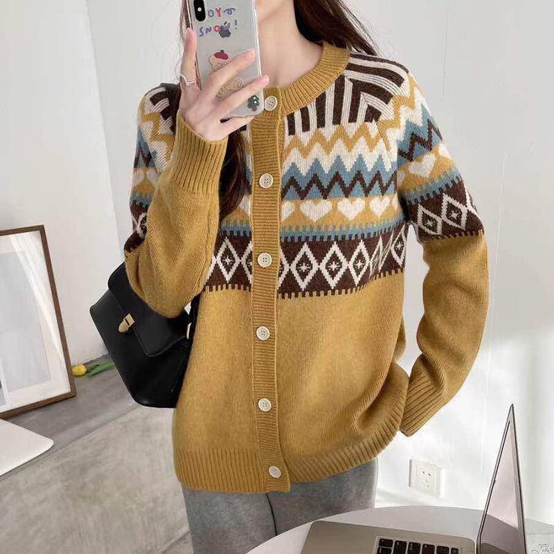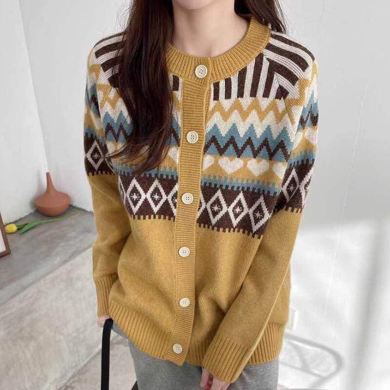 ジャカードセーター秋冬服長袖カーディガンルーズ O ネックニットトップス Roupas ロング オータム 秋物 ウィンター 冬物 Oネック