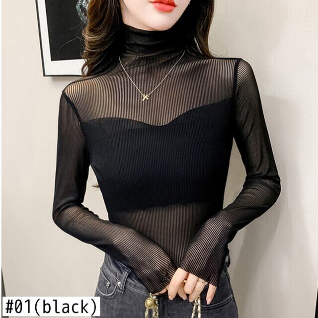 秋冬中空タートルネック Tシャツメッシュ長袖トップススリムブラック Tシャツ Tシャツ ロング オータム 秋物 ウィンター 冬物
