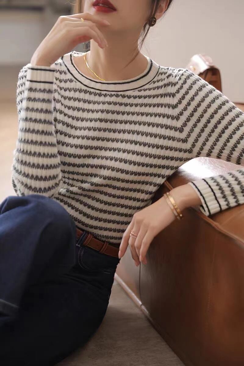プル服 O ネックストライプスリムセーター長袖プルオーバー秋冬ニットトップス ロング オータム 秋物 ウィンター 冬物 Oネック