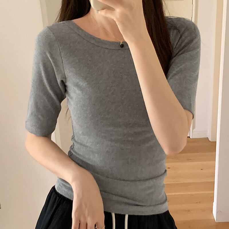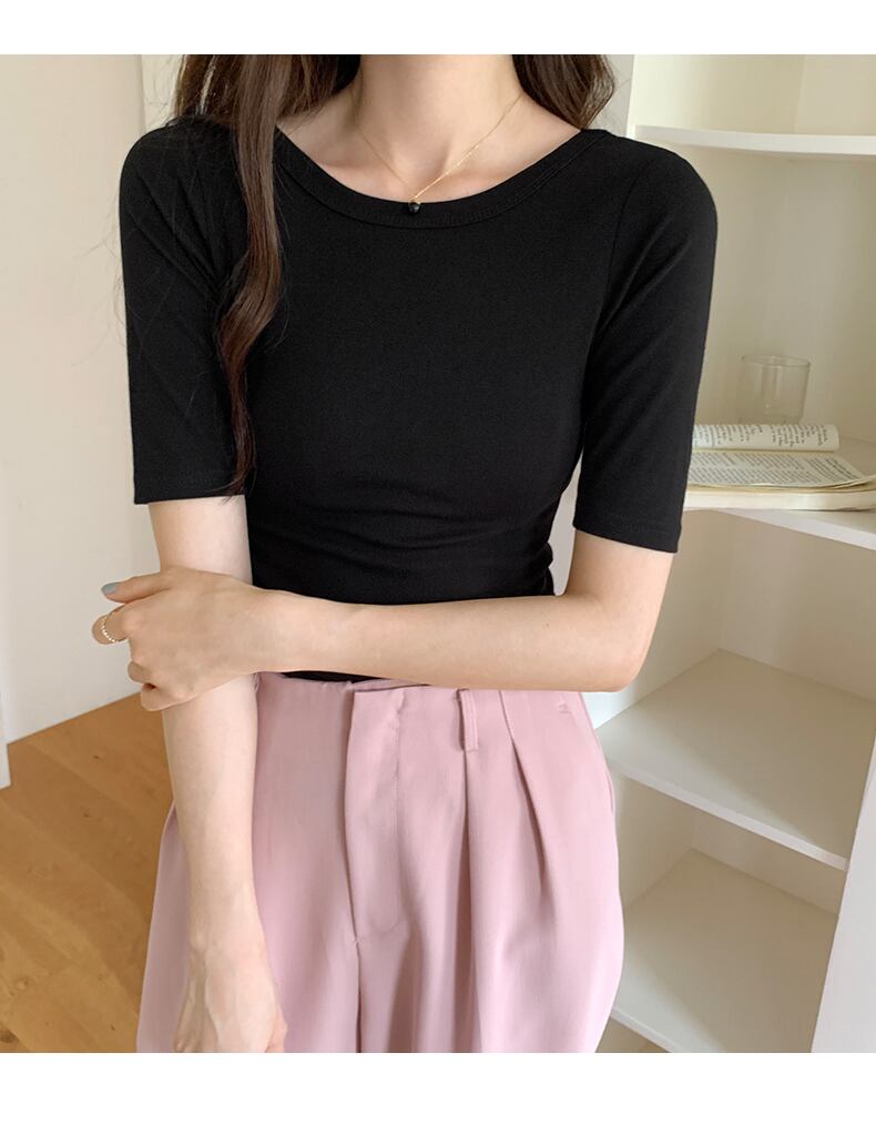 O ネック半袖白 Tシャツ弾性 Tシャツ春夏レディーススキニー Tシャツトップス ショート ホワイト ハーフスリーブ エラスティック 伸縮 スプリング 春物 サマー 夏物