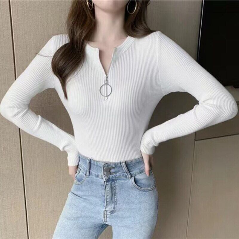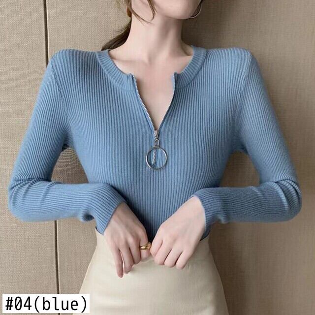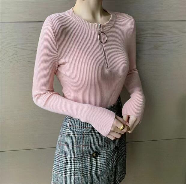 秋冬服ジッパー O ネックセータープルオーバースリムピンクセーター長袖ニットトップス ロング オータム 秋物 ウィンター 冬物 Oネック
