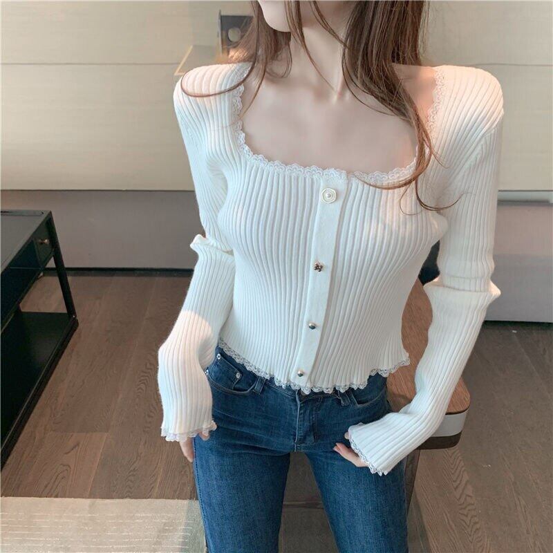 レースパッチワーク白黒セーター秋冬プルオーバーセーター長袖ニットクロップトップスジャージ ロング ホワイト ブラック オータム 秋物 ウィンター 冬物