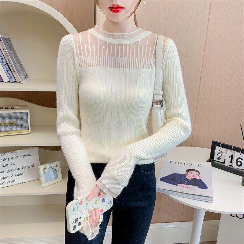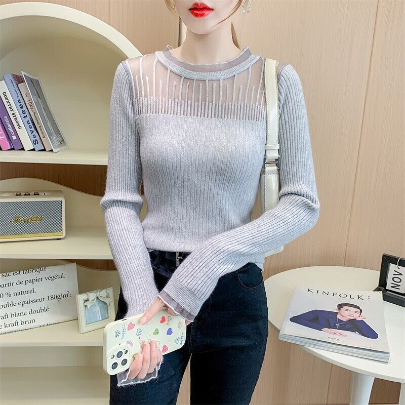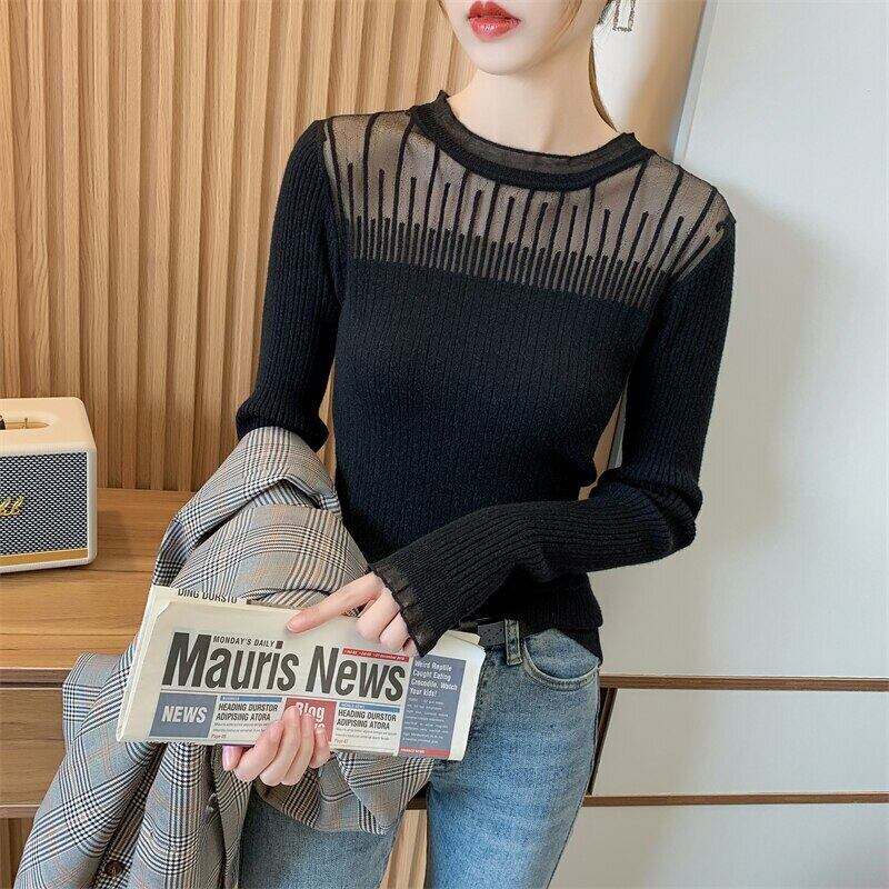 秋冬服 O ネック中空黒セータースリム長袖プルオーバーニットトップス ロング ブラック オータム 秋物 ウィンター 冬物 Oネック