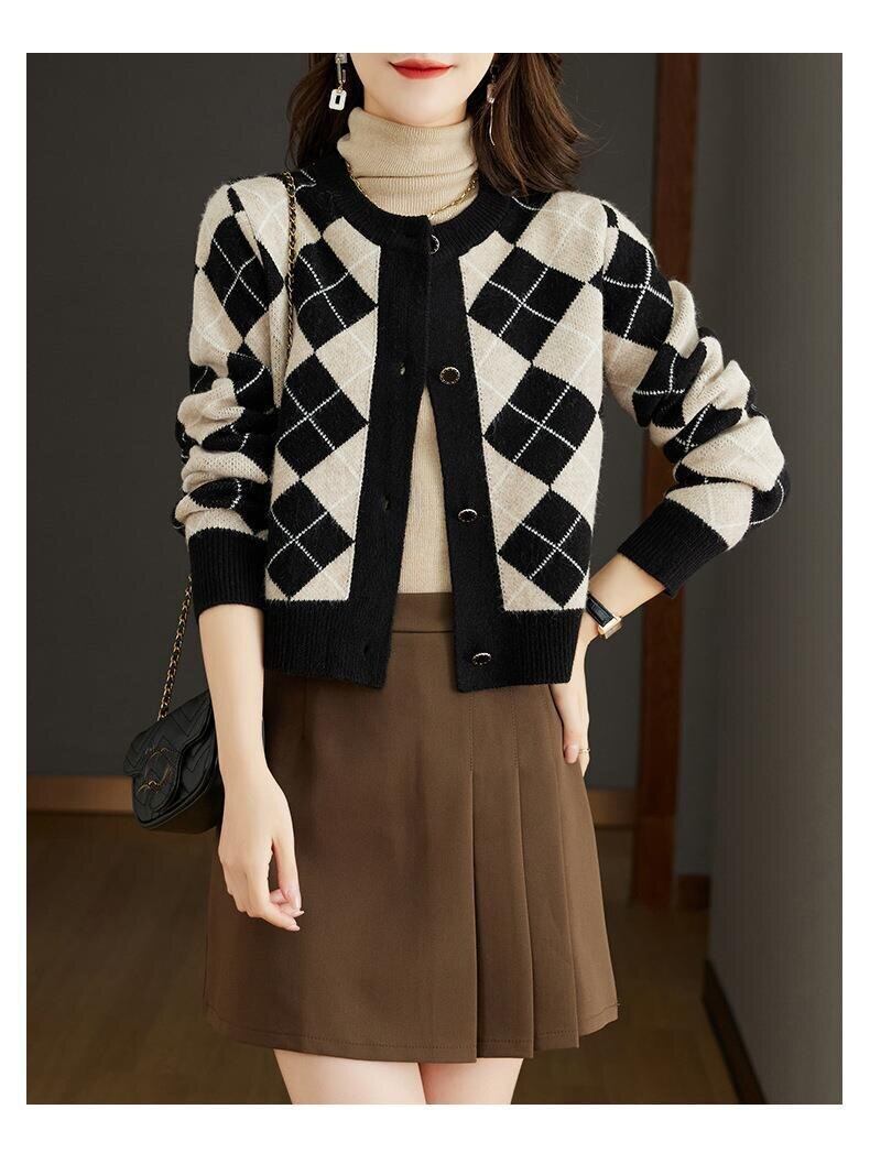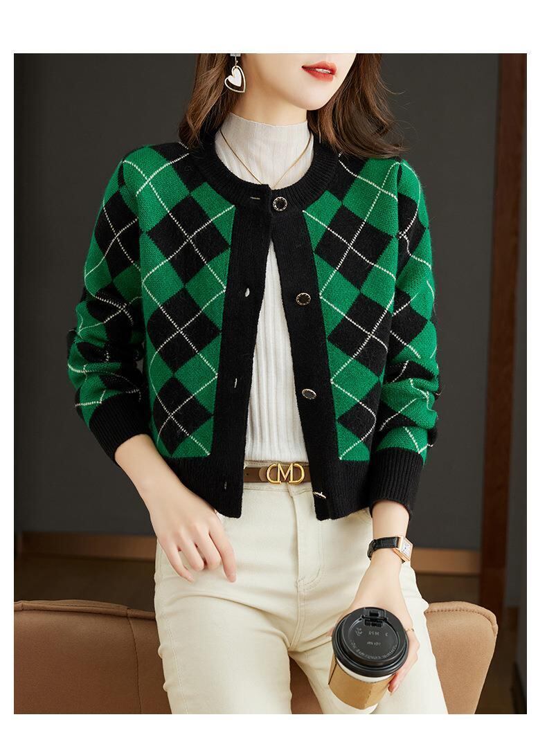 O ネックチェック柄カーディガンセーター秋冬長袖ニットクロップトップス ロング オータム 秋物 ウィンター 冬物 Oネック