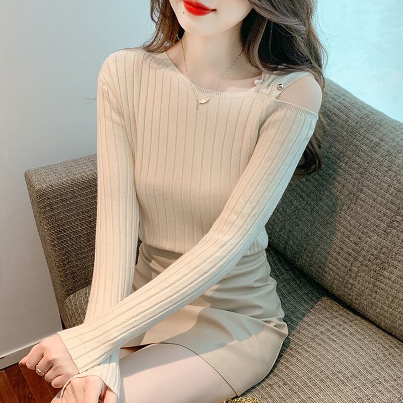 オフショルダー白セーター秋冬レディースプルオーバー長袖ニットトップス ロング ホワイト オータム 秋物 ウィンター 冬物