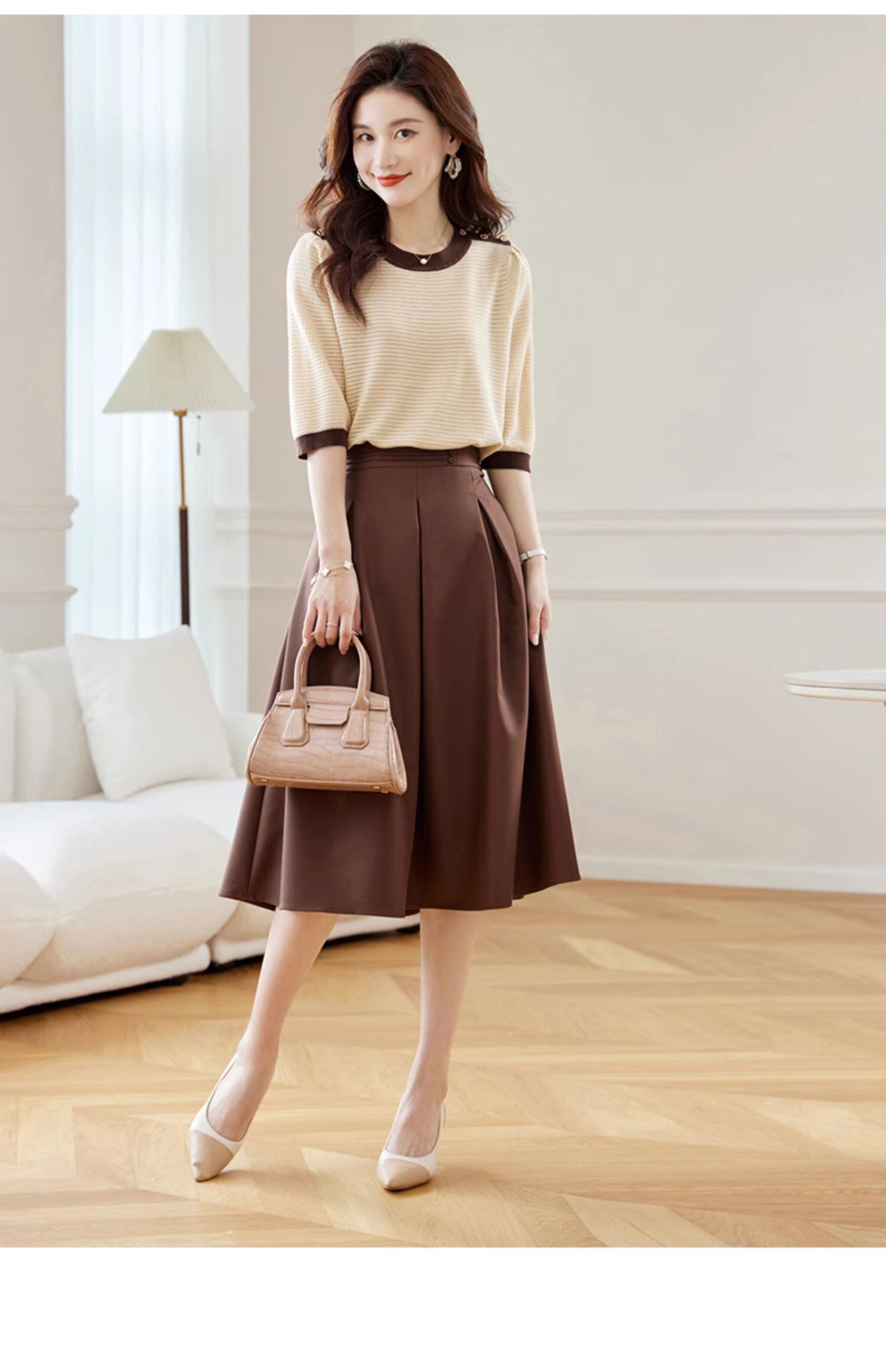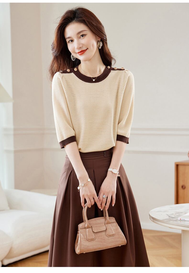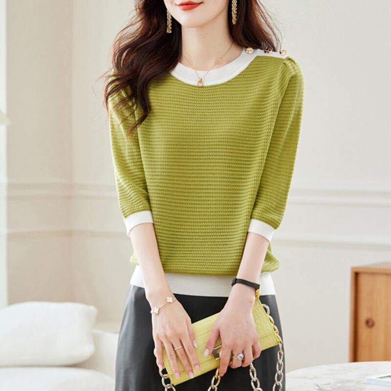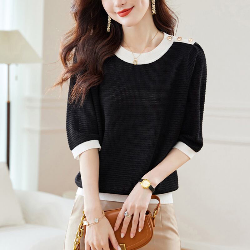中空アウトニットトップス Tシャツ春秋ボタン Tシャツ O ネック半袖 Tシャツ ショート ハーフスリーブ スプリング 春物 オータム 秋物 Oネック