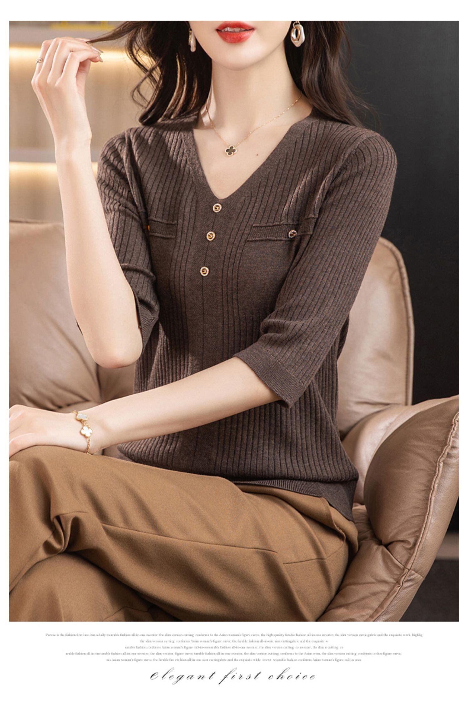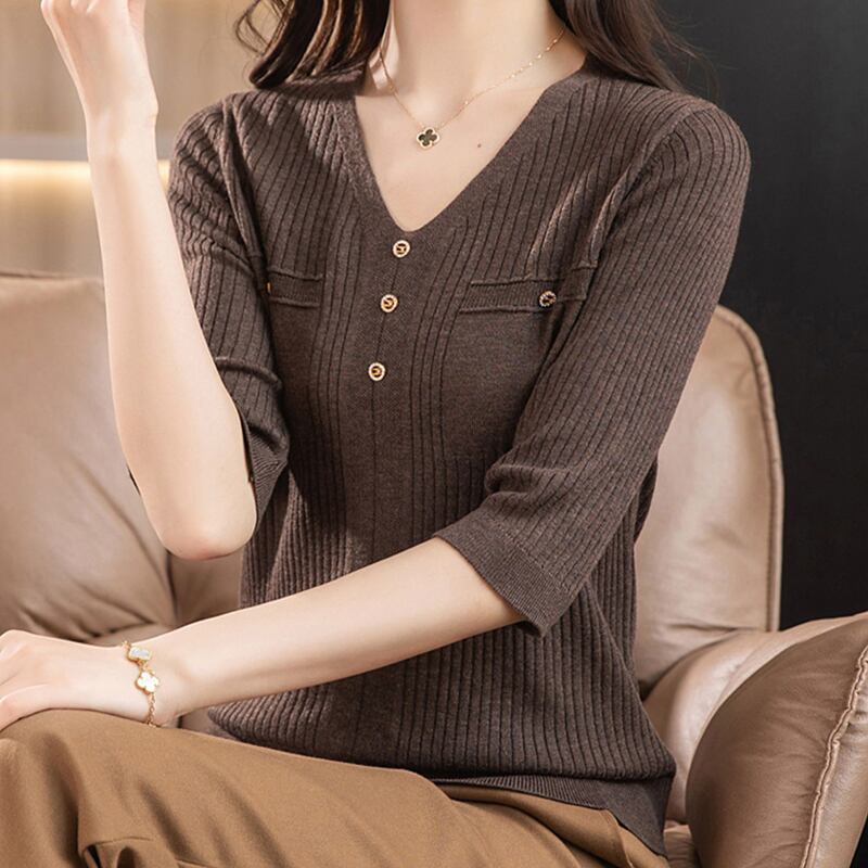 春夏黒 Tシャツ七分袖ニットトップス V ネックルーズ Tシャツ Tシャツ ショート ブラック 半袖 ハーフスリーブ スプリング 春物 サマー 夏物 Vネック