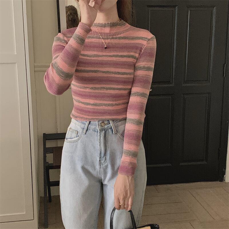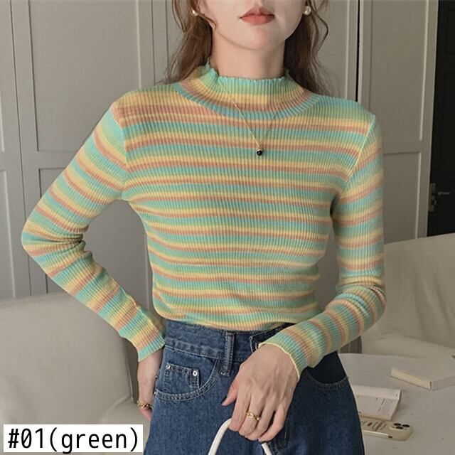 ストライプセーター秋冬ハーフカラープルオーバーニットトップス長袖スリムジャンパーセーター ロング オータム 秋物 ウィンター 冬物