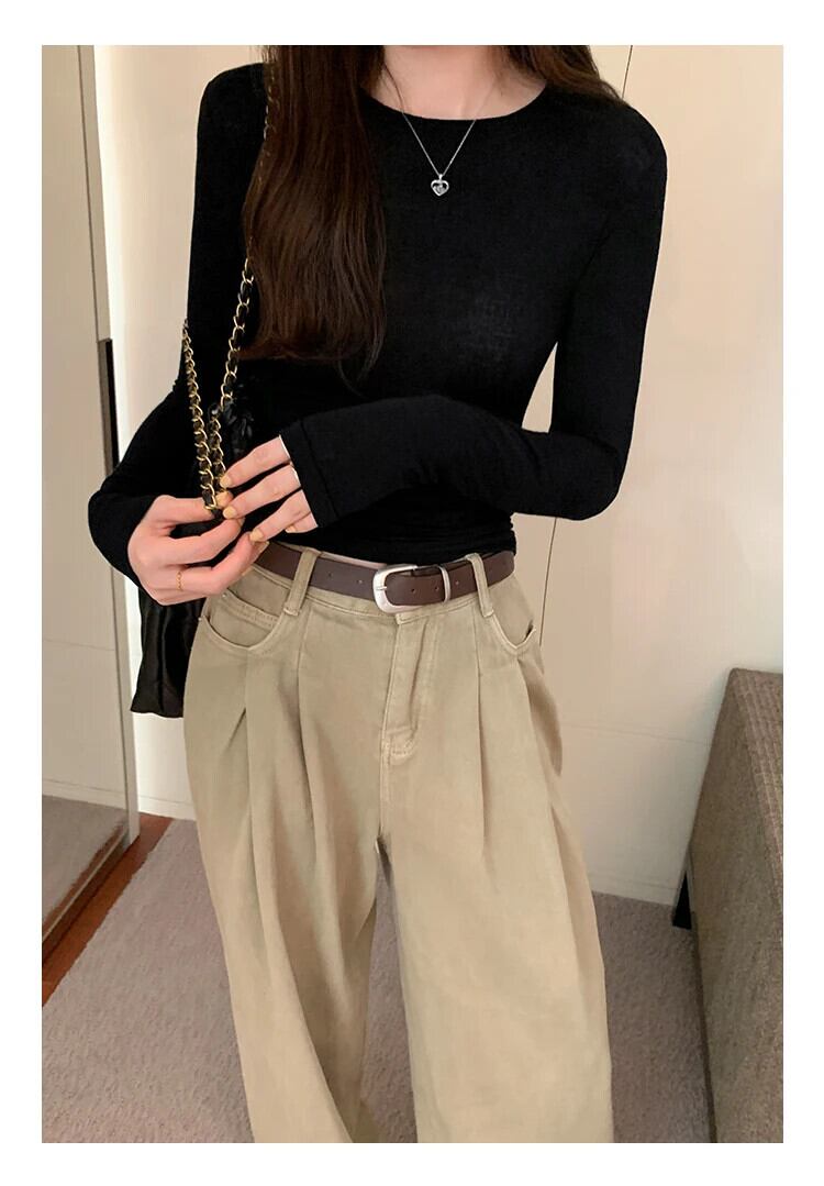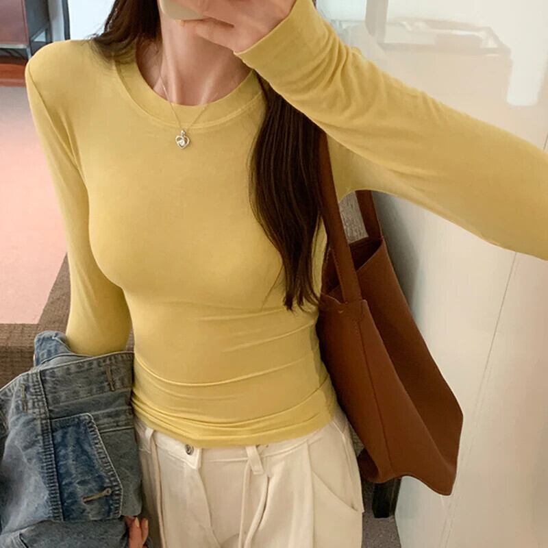 O ネックソリッドベーシック長袖 Tシャツ春秋スタイルトップススリムボトム Tシャツ Tシャツ ロング スプリング 春物 オータム 秋物 ソリッドカラー