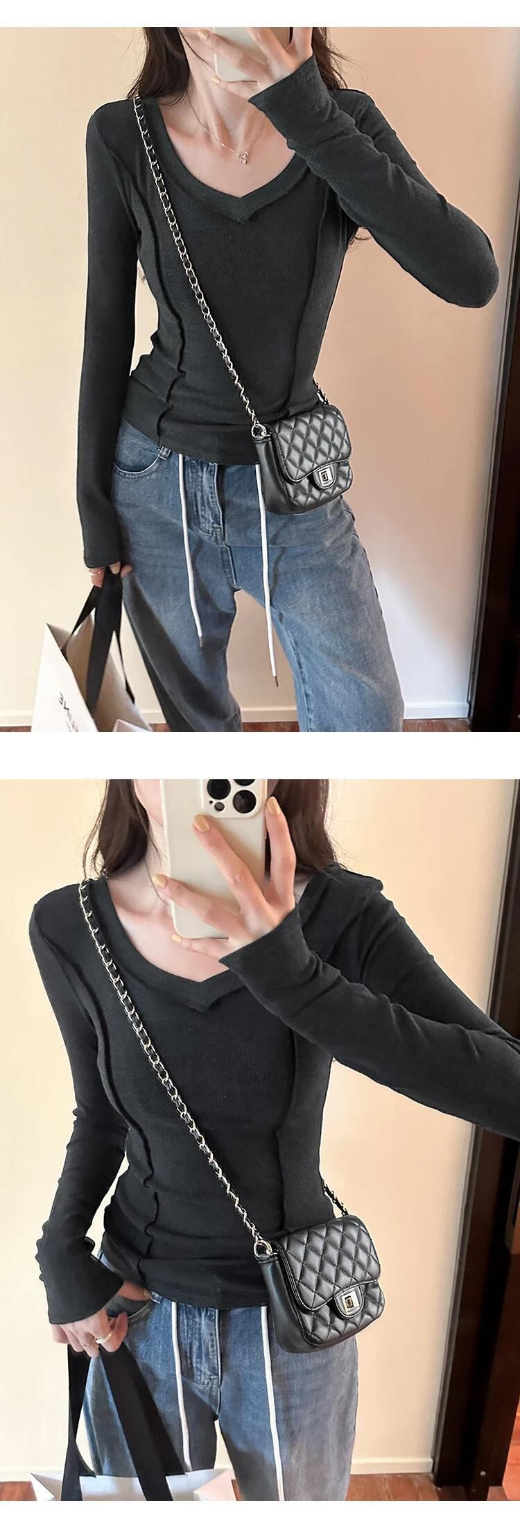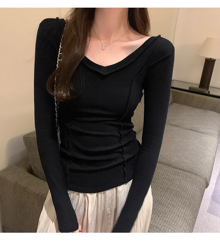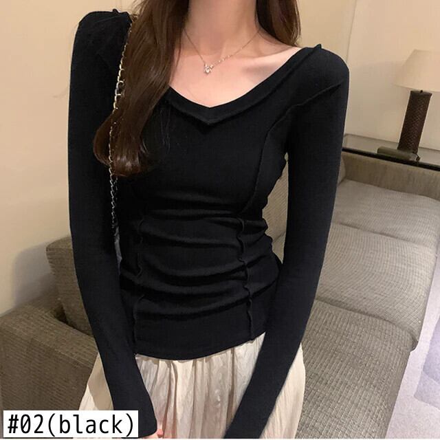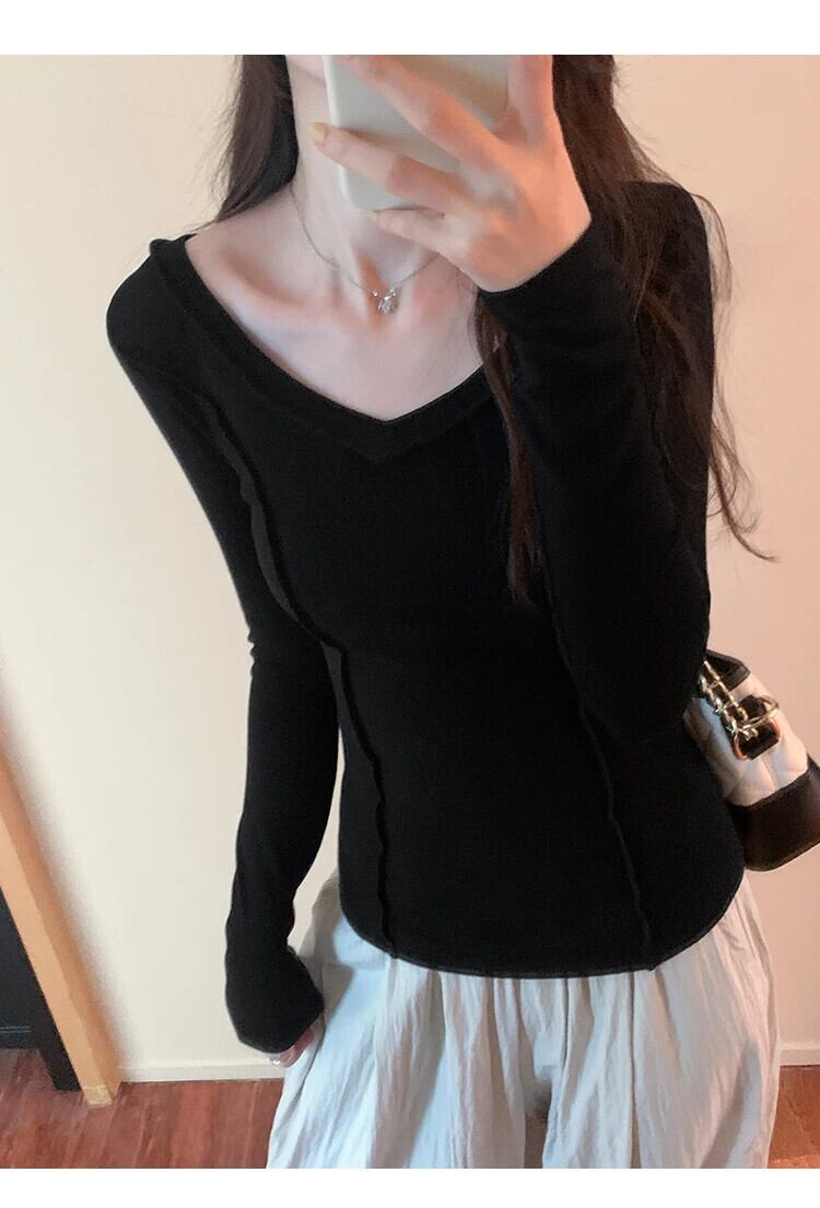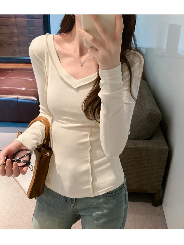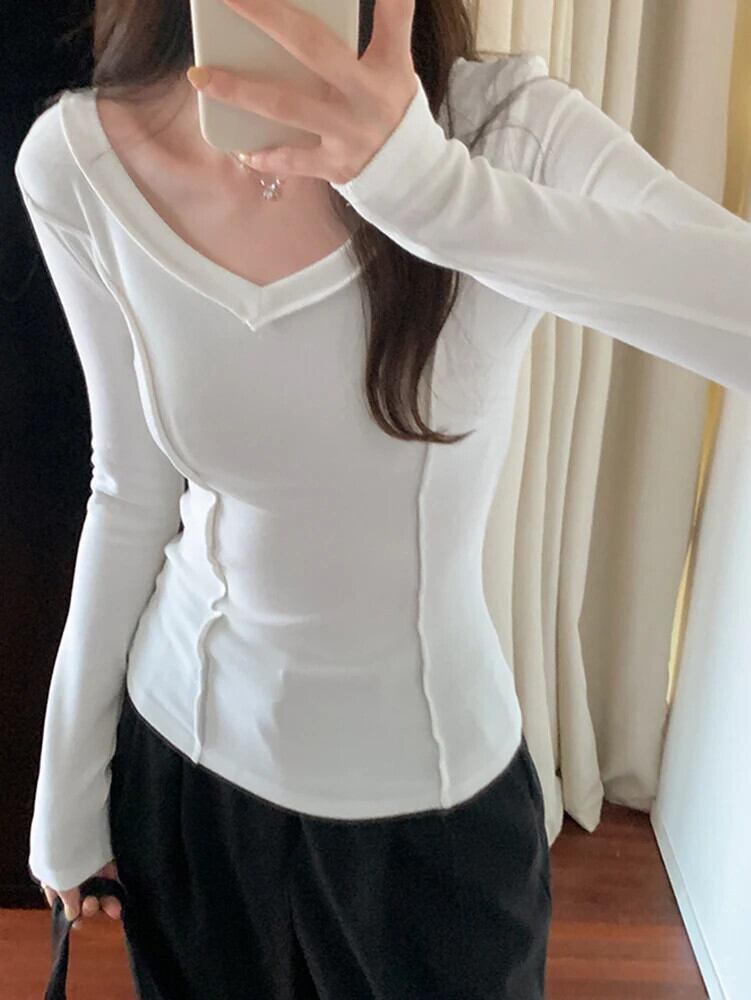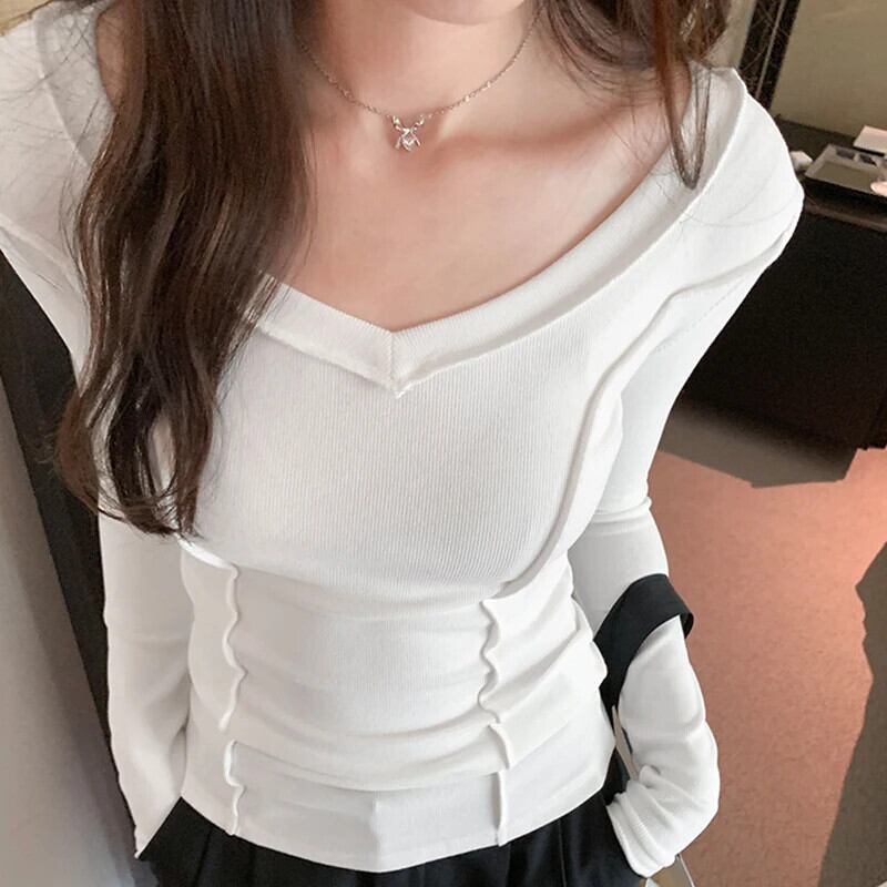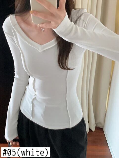 Tシャツ秋婦人白 Tシャツ長袖 Tシャツセクシースリム V ネックトップ ロング ホワイト オータム 秋物 Vネック