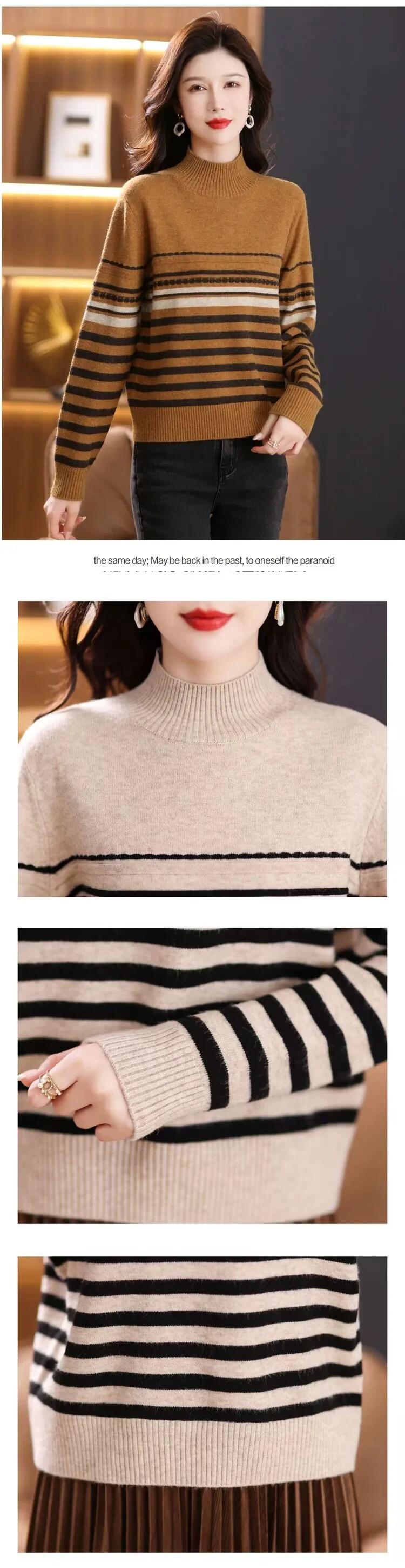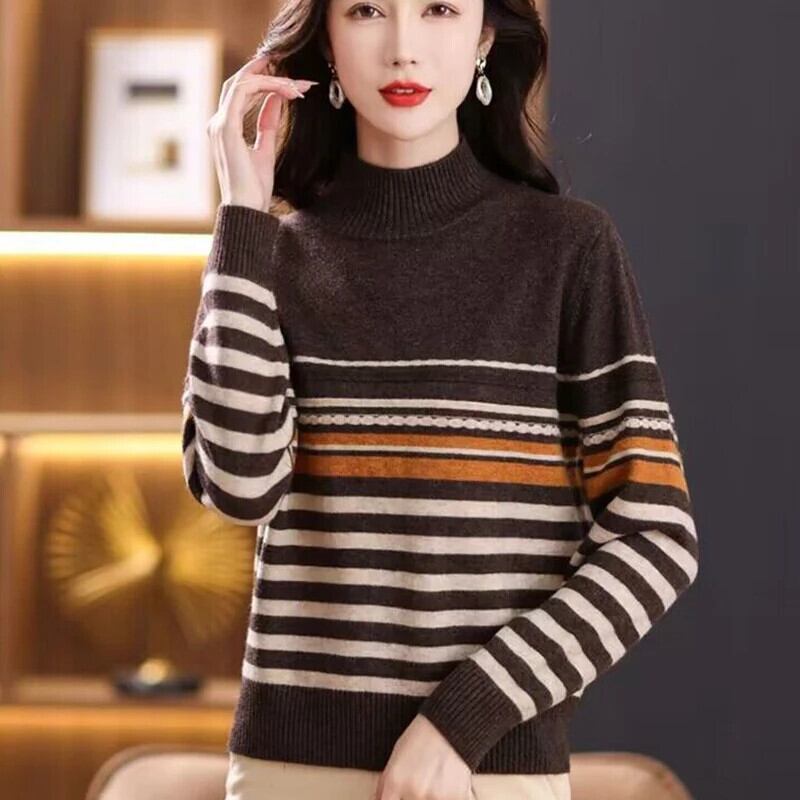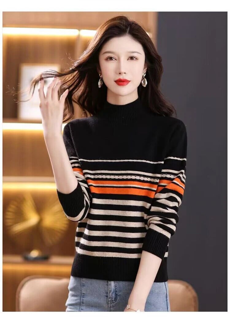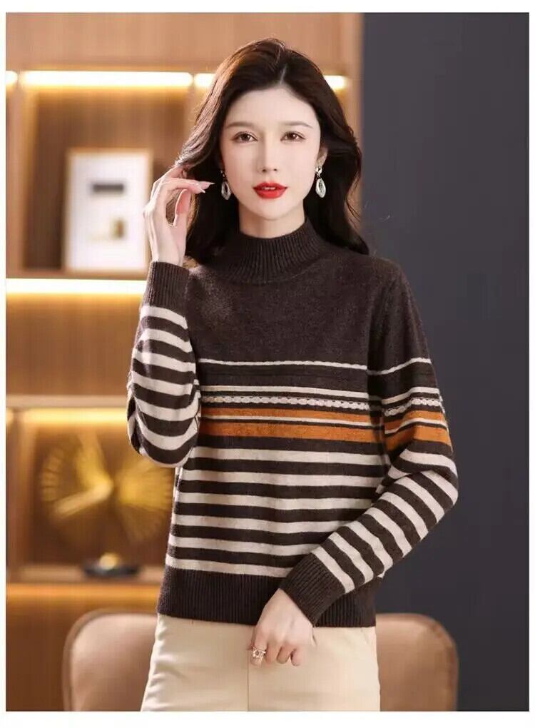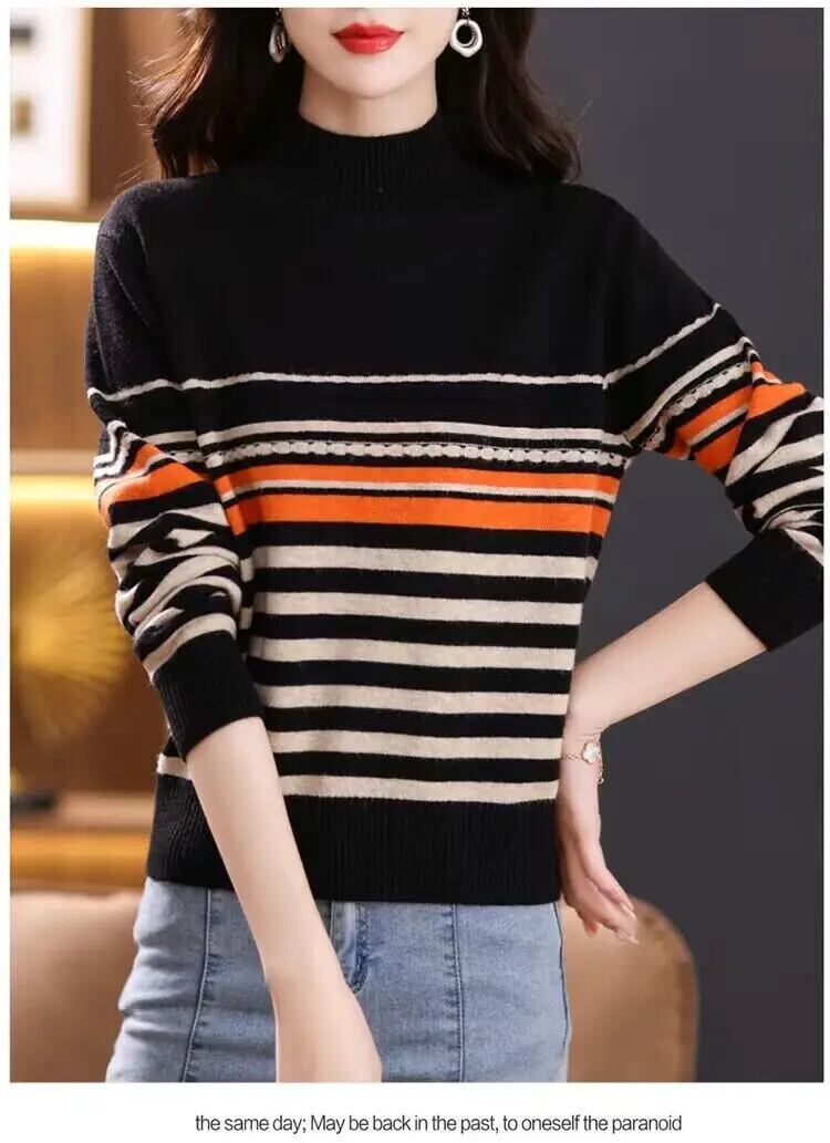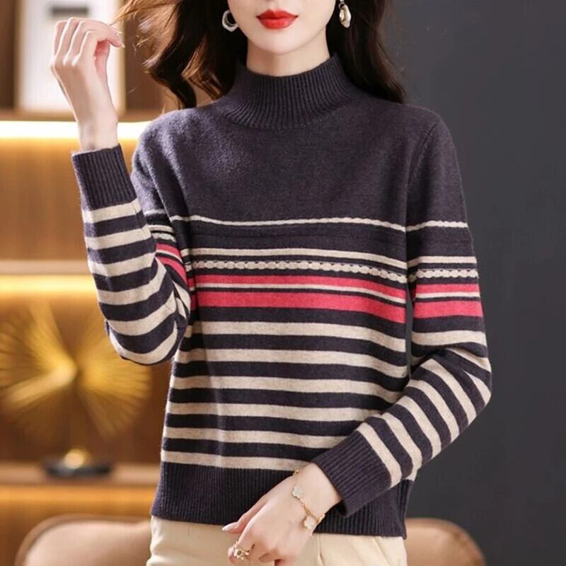 長袖ストライプタートルネックセータープルオーバーニット厚く暖かいニットトップス秋冬プル ロング オータム 秋物 ウィンター 冬物