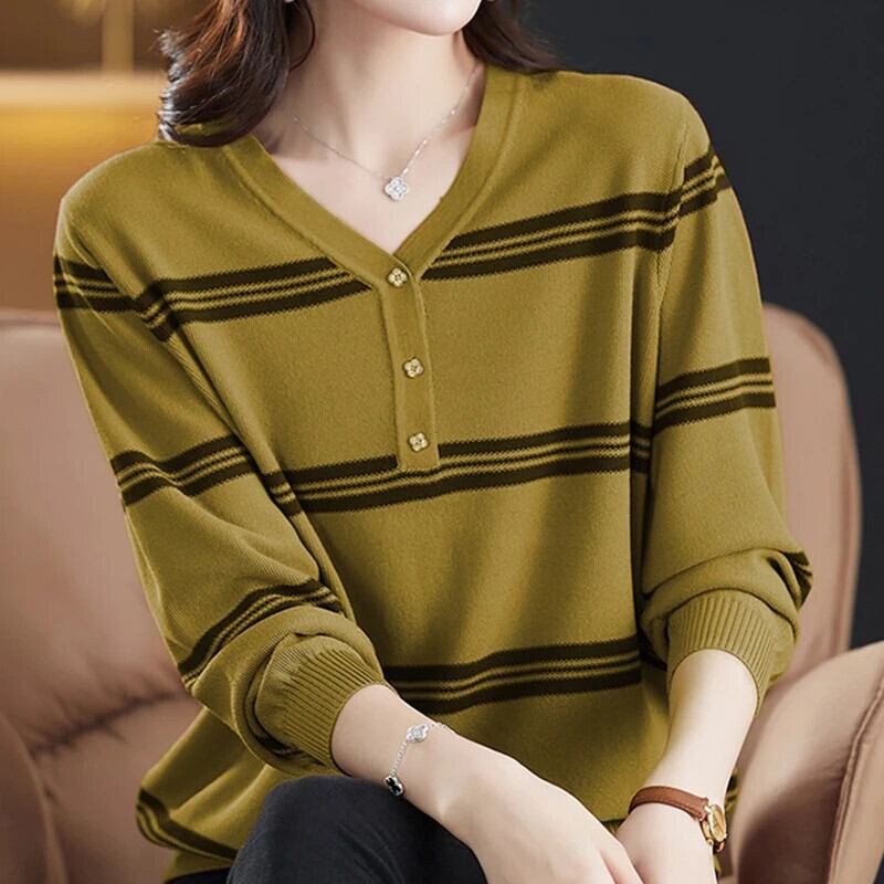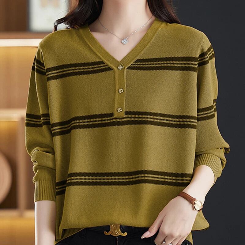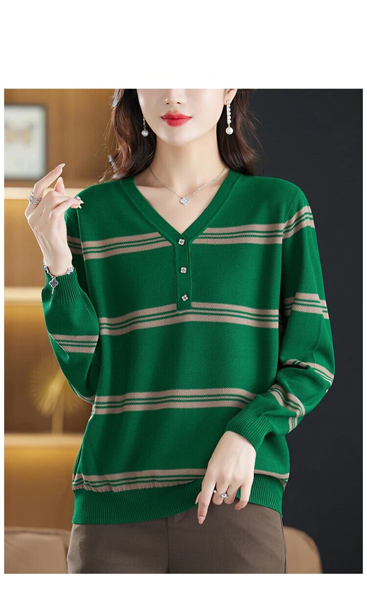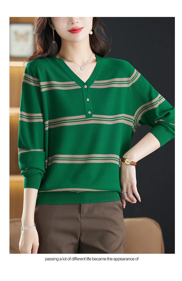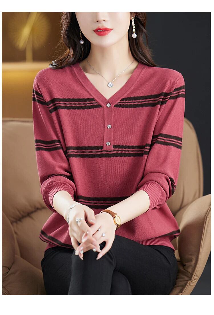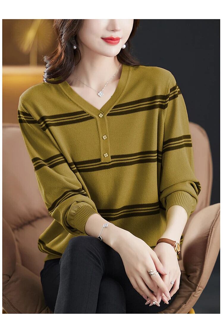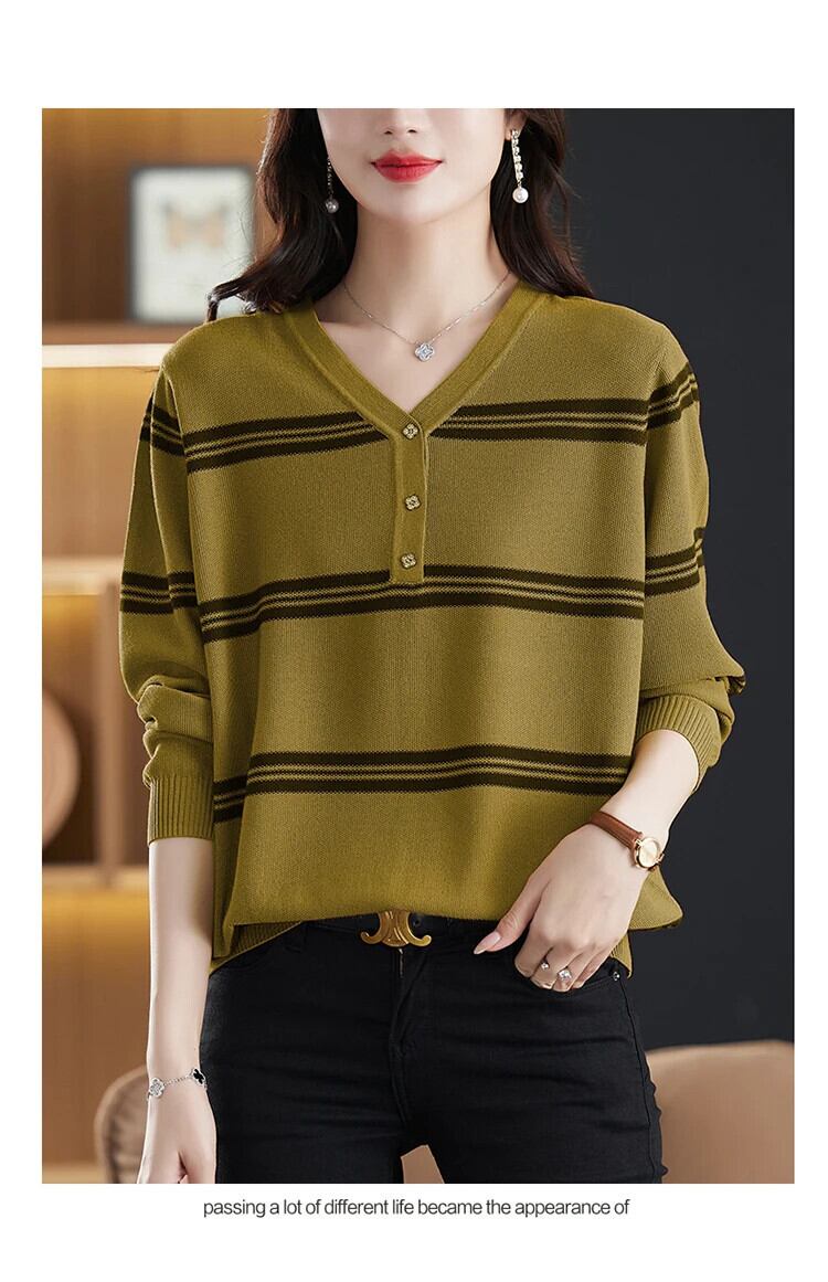 レディース秋冬ストライプ長袖セーター V ネックニットトッププルオーバーニット ロング オータム 秋物 ウィンター 冬物 Vネック