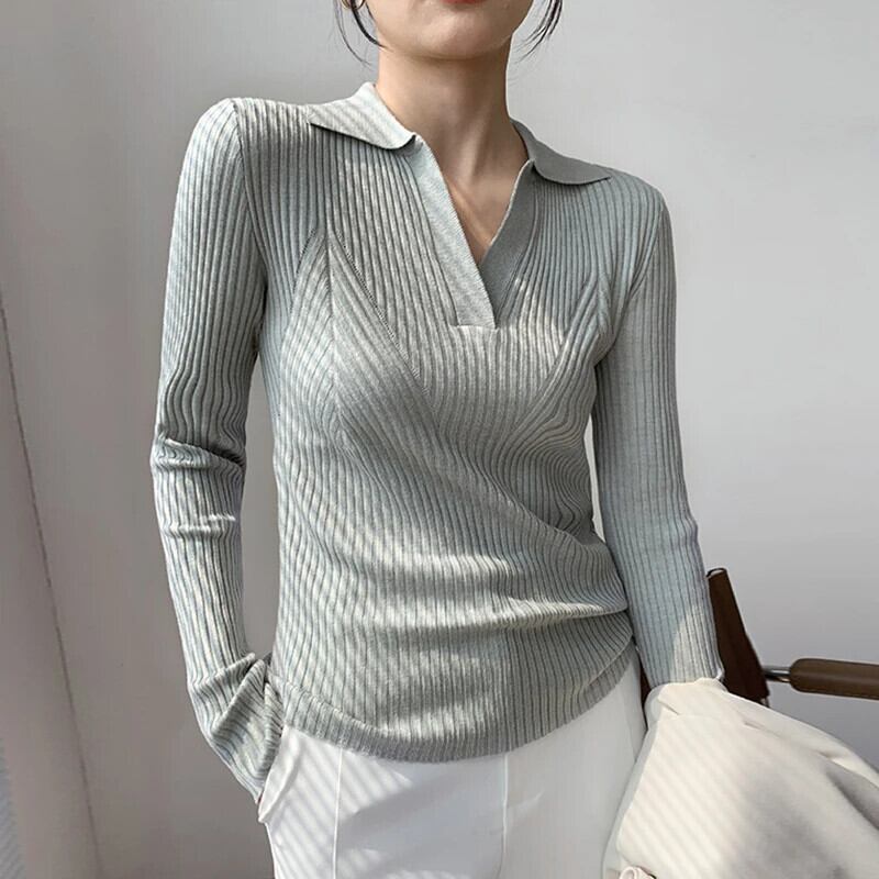 長袖黒セーターターンダウン襟ジャージ秋冬スリムプルオーバーニットトップスプル ロング ブラック オータム 秋物 ウィンター 冬物