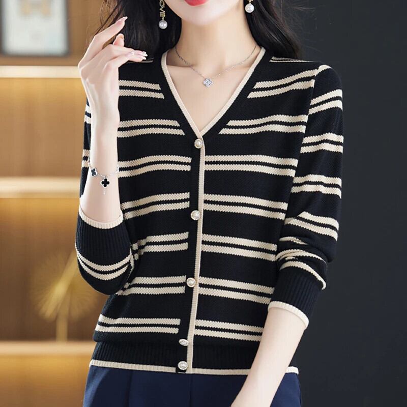 ストライプ長袖セーター秋 V ネックニットトップス冬レディースプルオーバーニット Roupas ロング オータム 秋物 ウィンター 冬物 Vネック