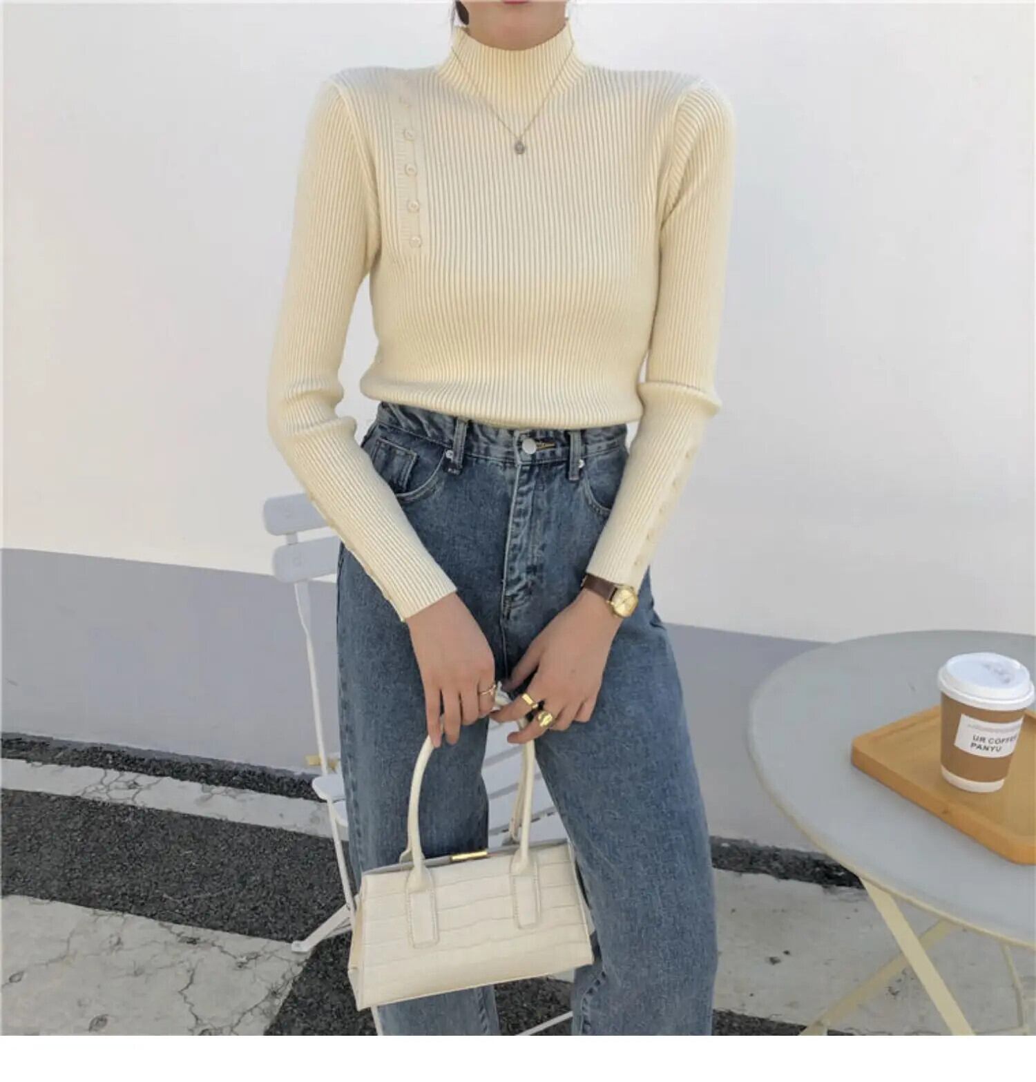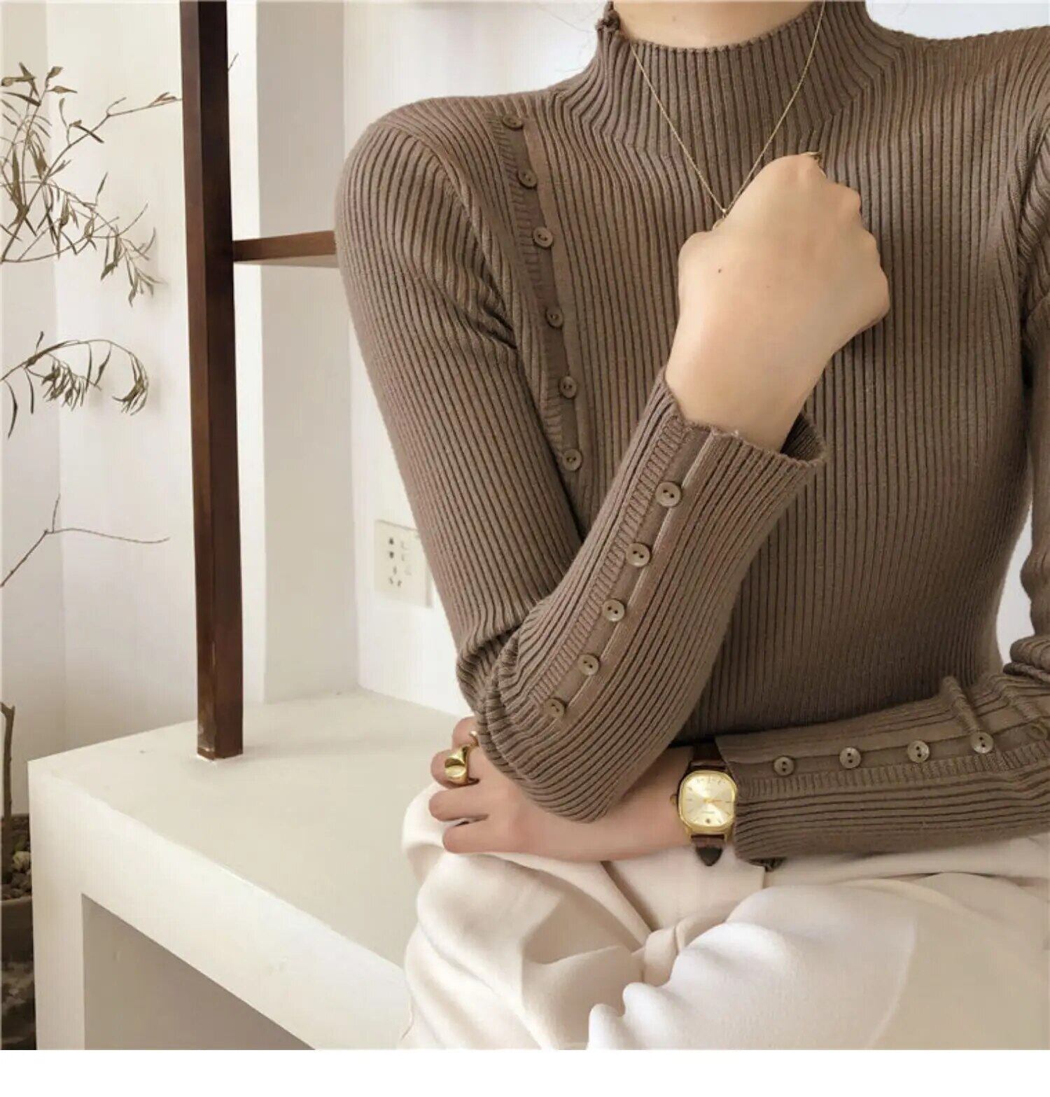 長袖半襟プルオーバーセーターボタンスリムボトムニットトップス秋冬 ロング オータム 秋物 ウィンター 冬物