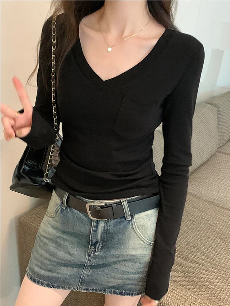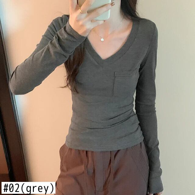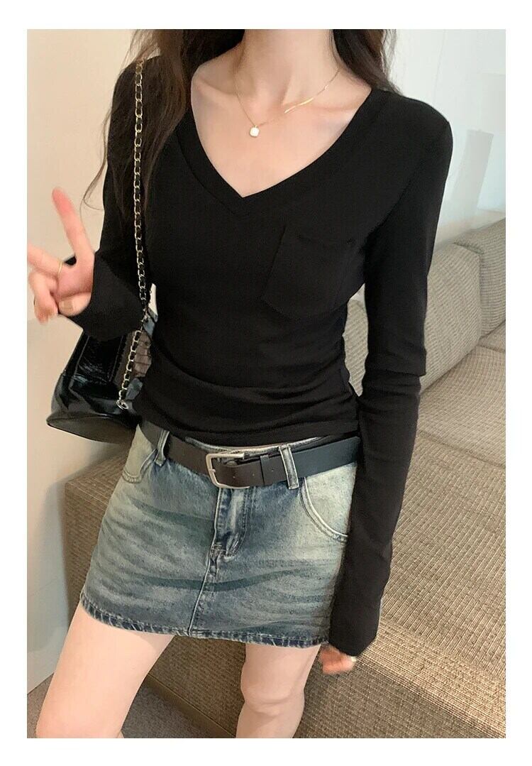 コットン Tシャツ春秋長袖トップス V ネックベーシック Tシャツ Camisetas デ ロング スプリング 春物 オータム 秋物 Vネック