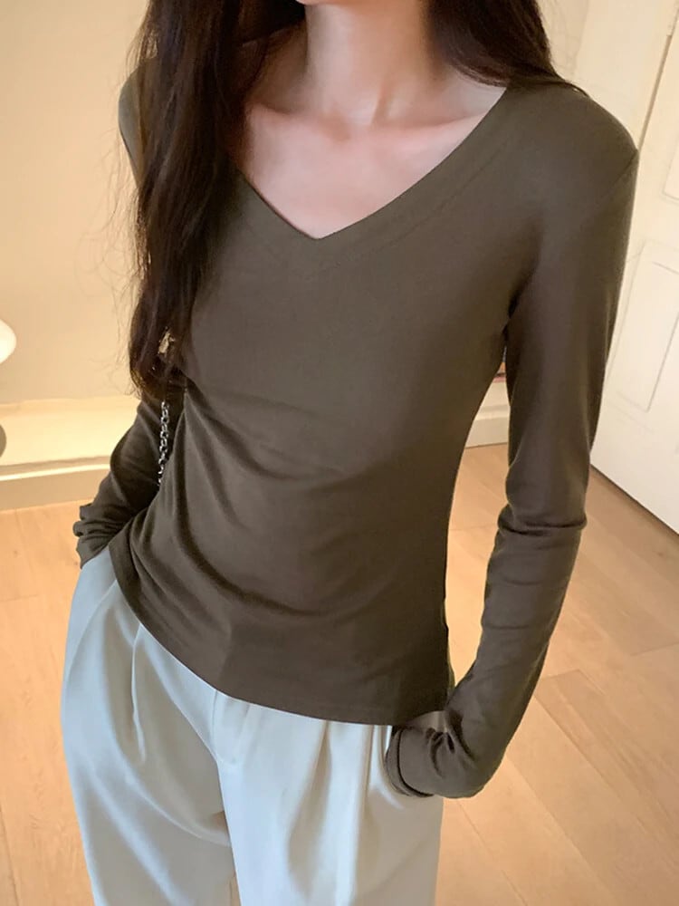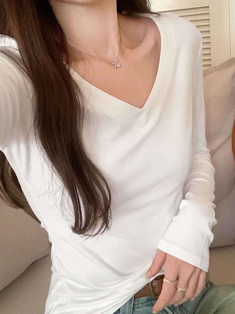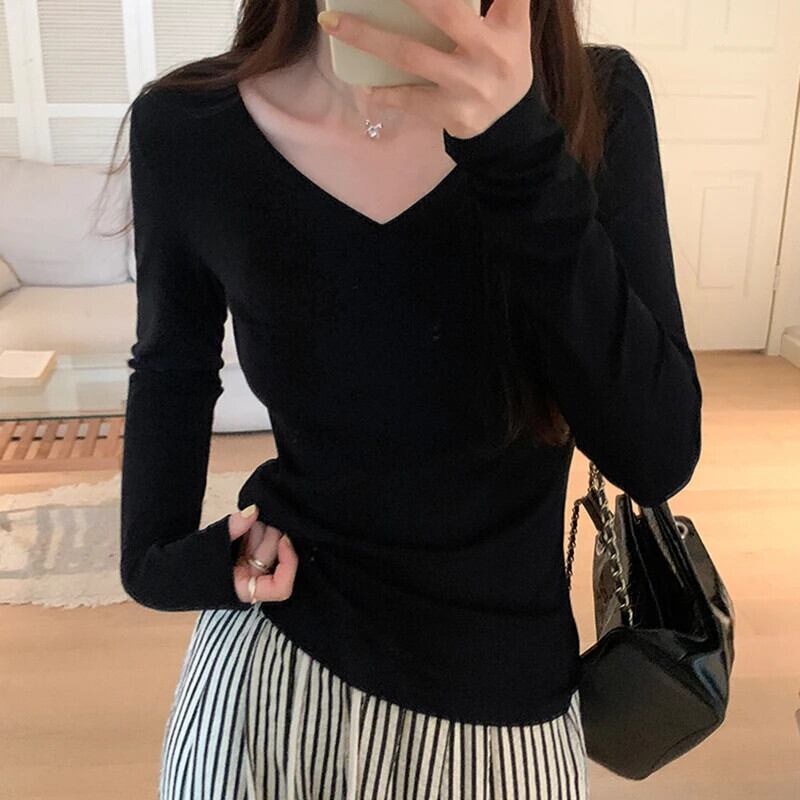 Tシャツコットン Tシャツ春長袖黒ベーシック Tシャツ V ネックスリムトップス秋 Ropa デ ロング ブラック スプリング 春物 オータム 秋物 Vネック