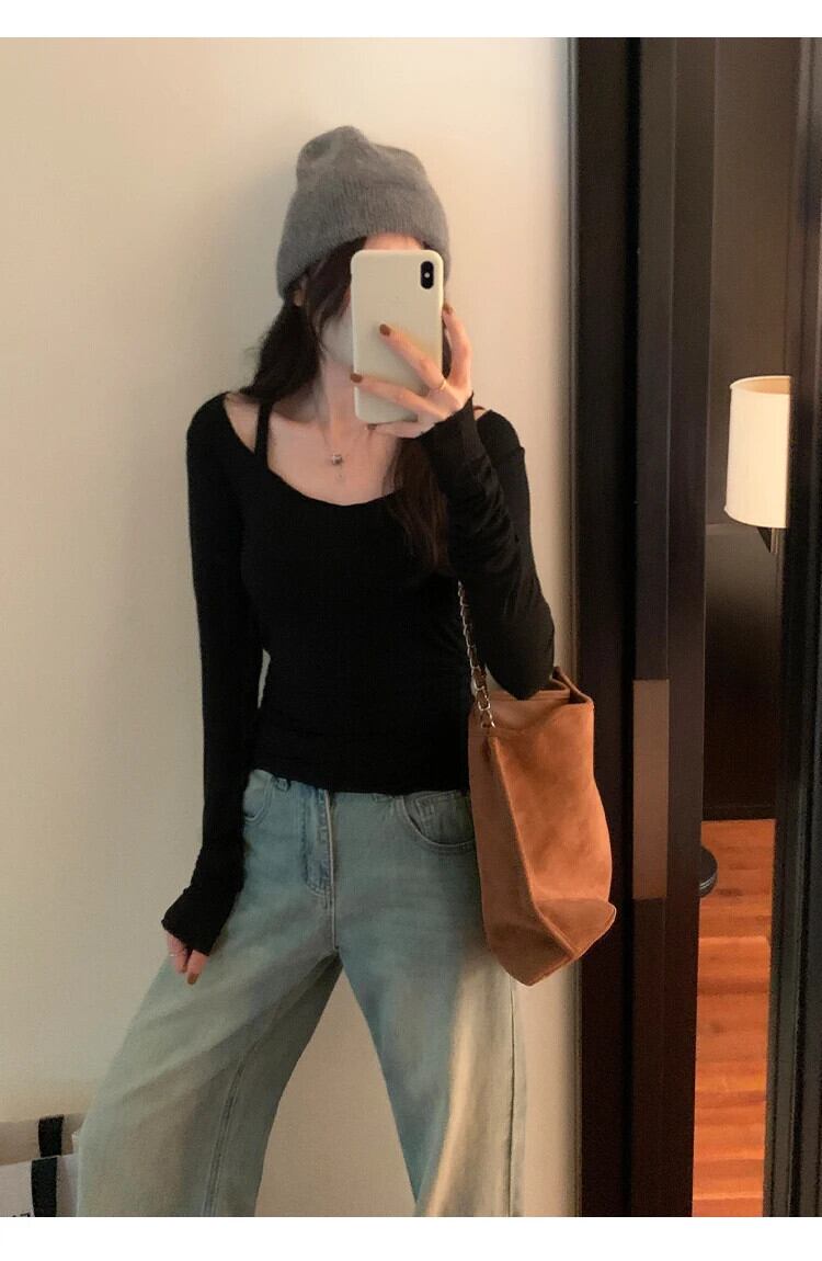 春秋セクシーディープ O ネック Tシャツピンク薄い Tシャツ長袖 Tシャツスタイル ロング スプリング 春物 オータム 秋物 Oネック