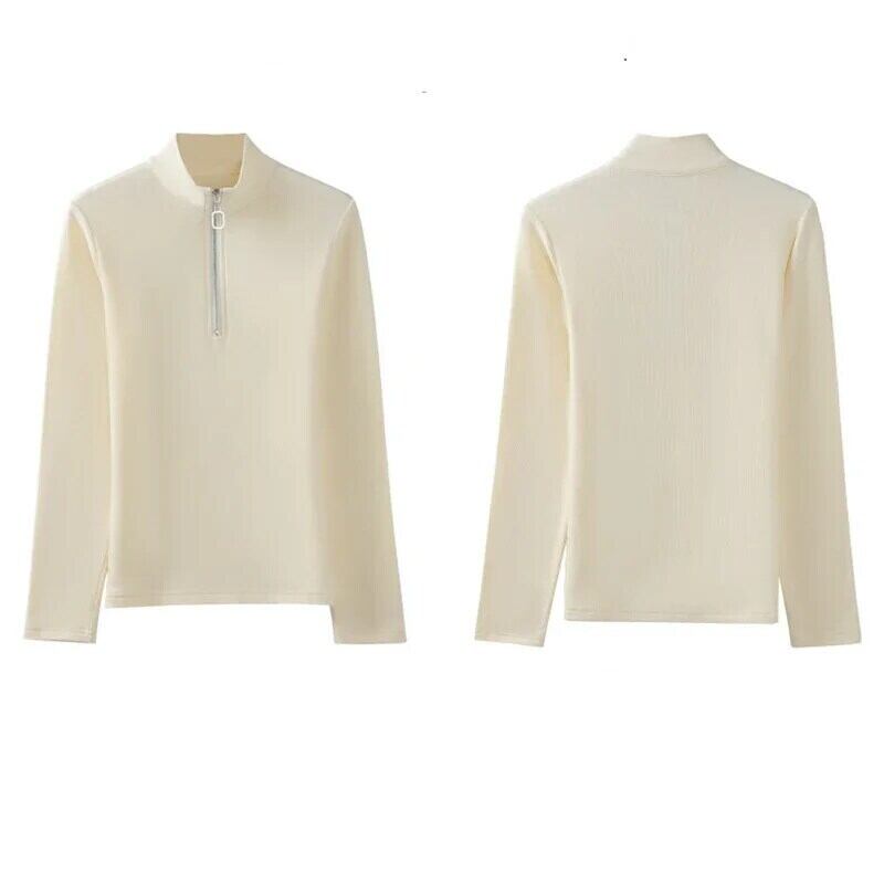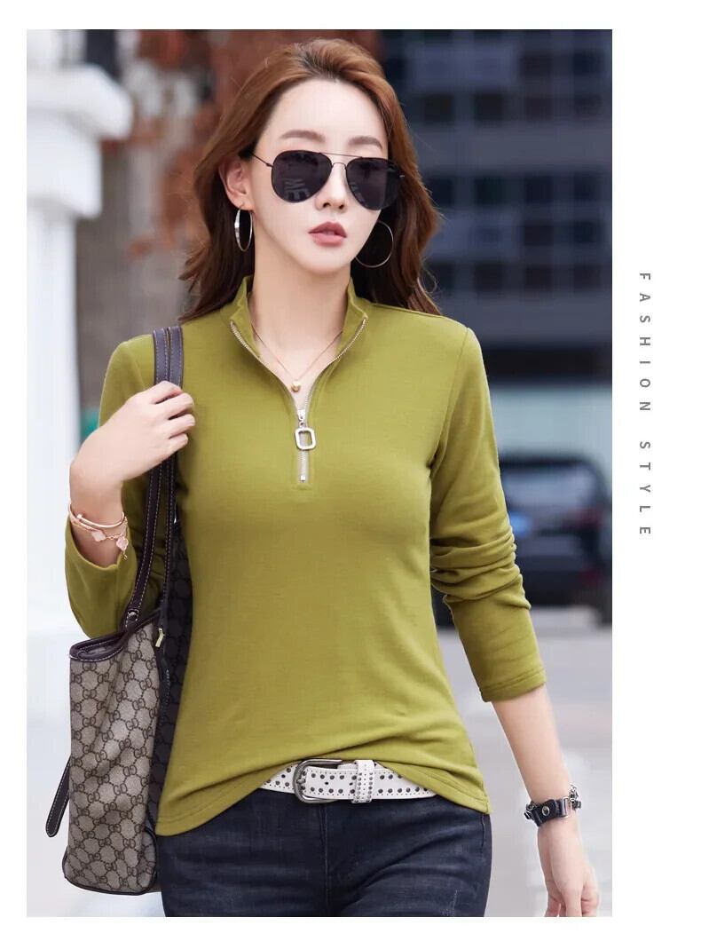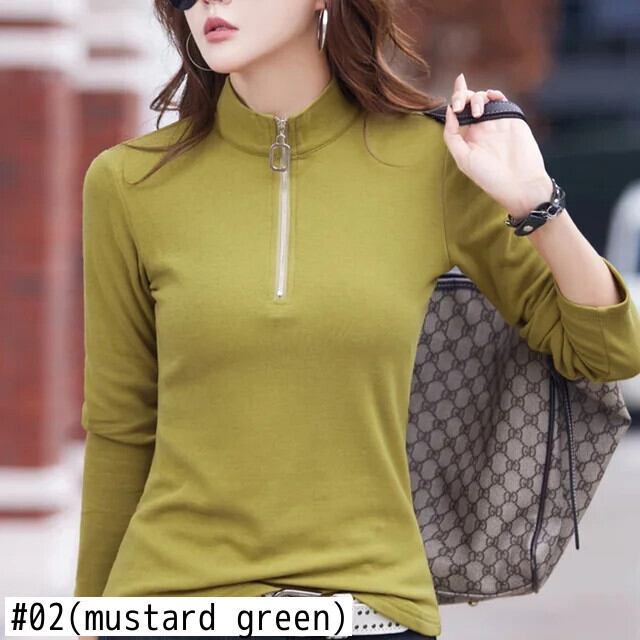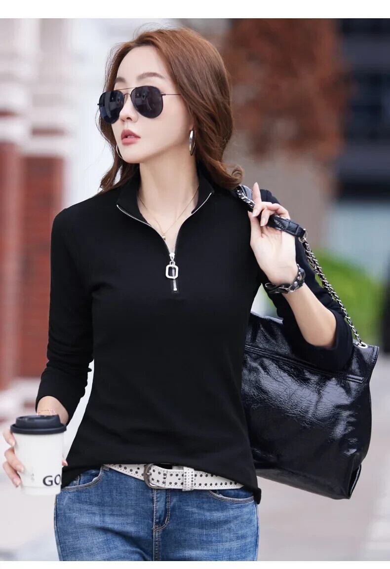 綿ジッパー長袖 Tシャツハーフネックスリム Tシャツスタイルトップス黒 Tシャツ春秋 ロング ブラック コットン スプリング 春物 オータム 秋物